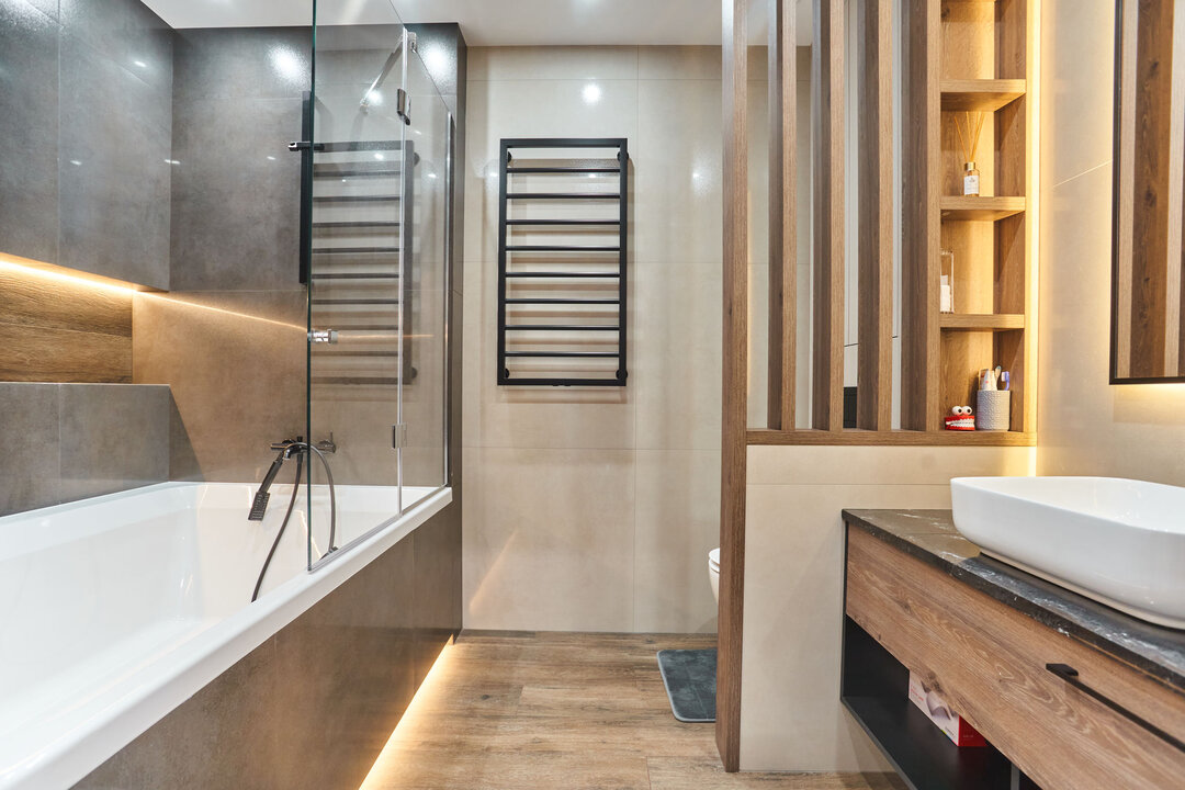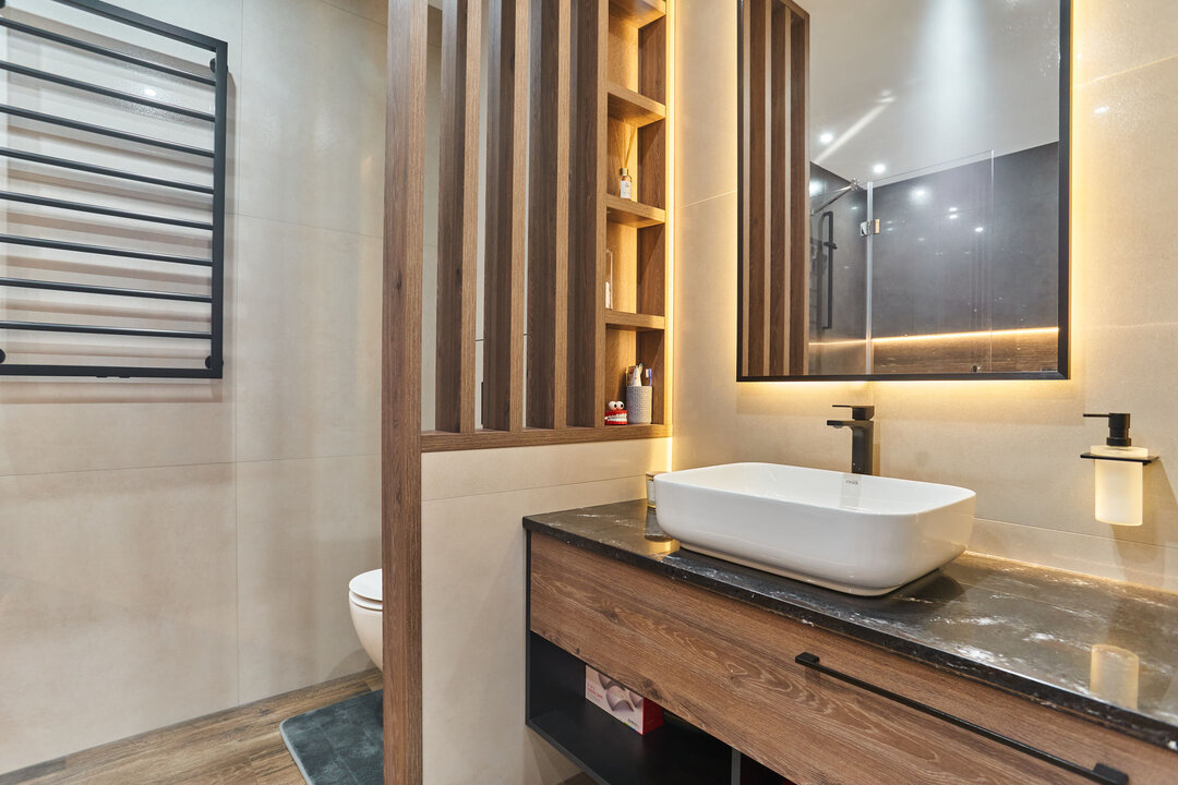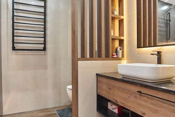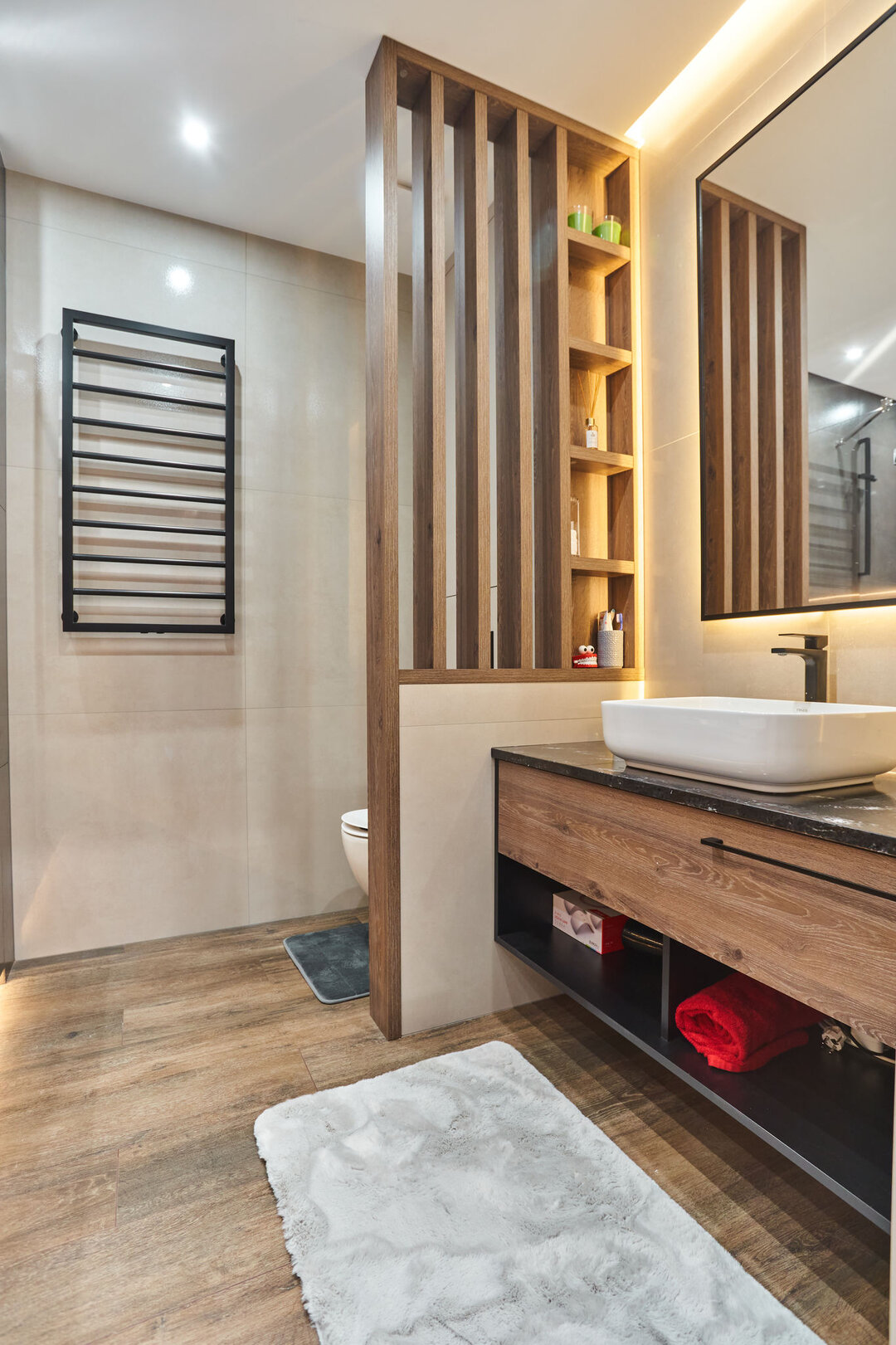 В санузле все стены и пол отделаны итальянским керамогранитом, две зоны разделены реечной конструкцией, подвесная вместительная тумба с накладной раковиной, большая ванна на двоих. Общая стилистика интерьера прослеживается в деталях — черная сантехника, ручки, рама зеркала.