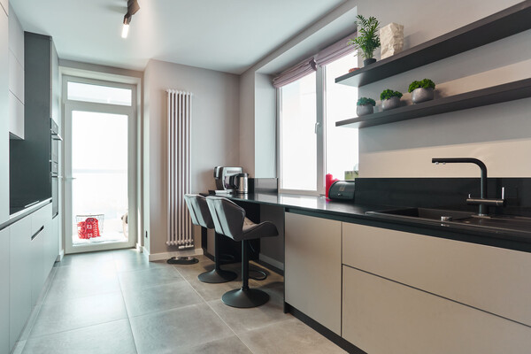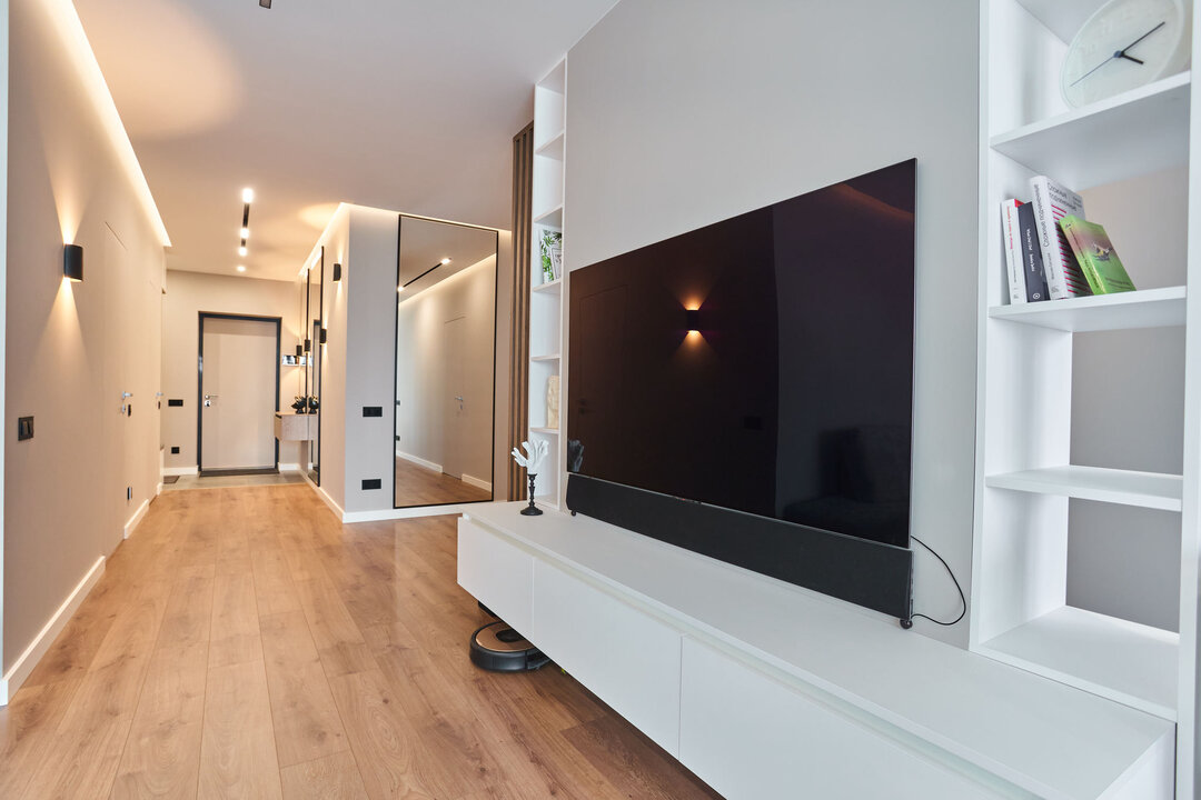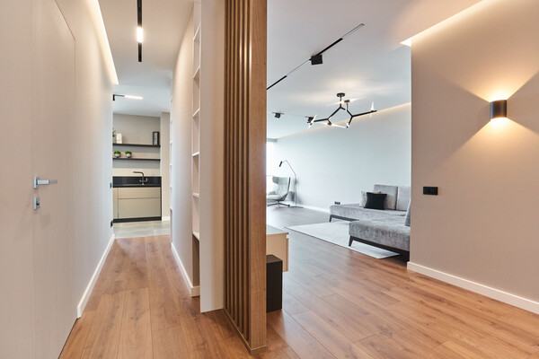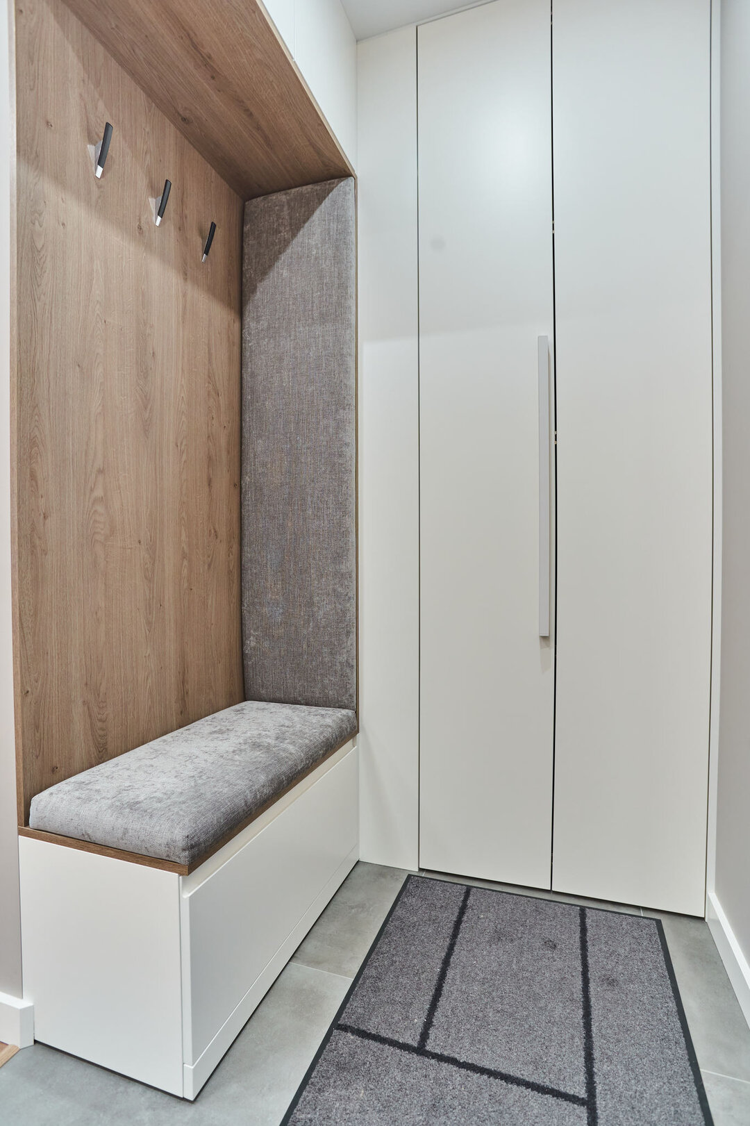 Возле прихожей находится постирочная с дверью скрытого монтажа — она выкрашена в цвет стен после установки. В постирочной установлена система принудительной вентиляции, чтобы убирать излишки влаги.