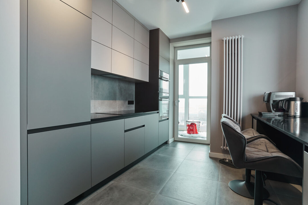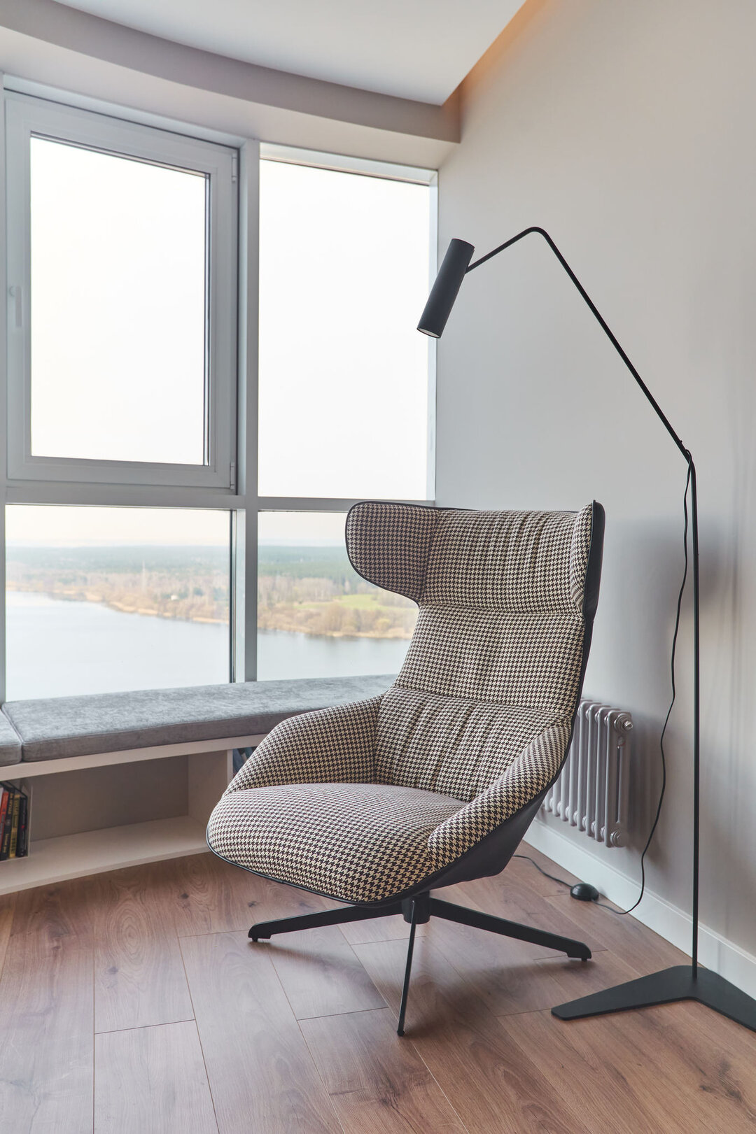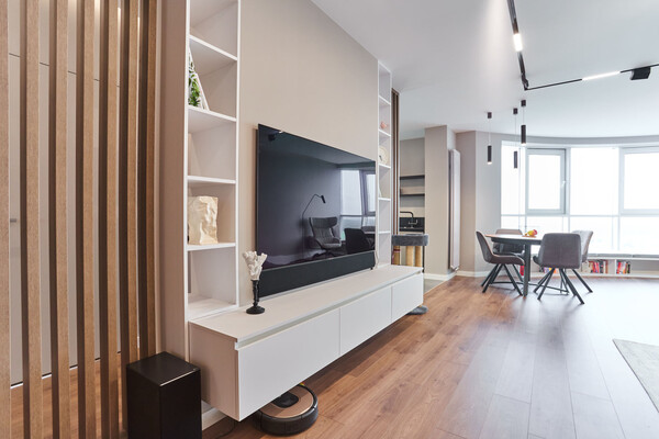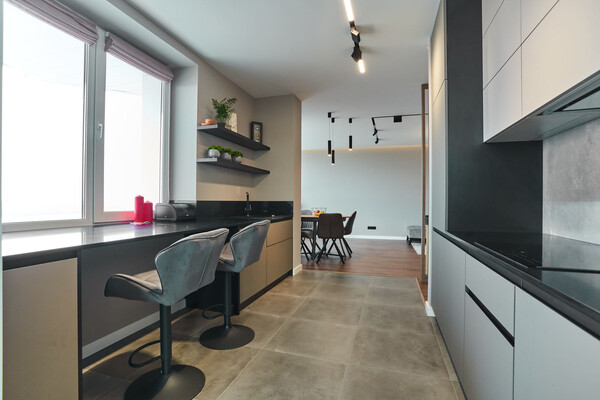 Проект выполнен в спокойной серо-бежевой гамме, которая является универсальным холстом для любых акцентных составляющих. Основной задачей проекта было создание функционального и современного пространства для жизни. Многие решения этим и обусловлены: зонирование и корректировка пространства кухни-гостиной реечными перегородками, чтобы не блокировать солнечный свет глухими стенами; вынос столовой группы в гостиную и оборудование подоконника-столешницы на кухне; индукционная поверхность со встроенной вытяжкой, чтобы исключить любые запахи, которые могут передаться в зал и так далее.