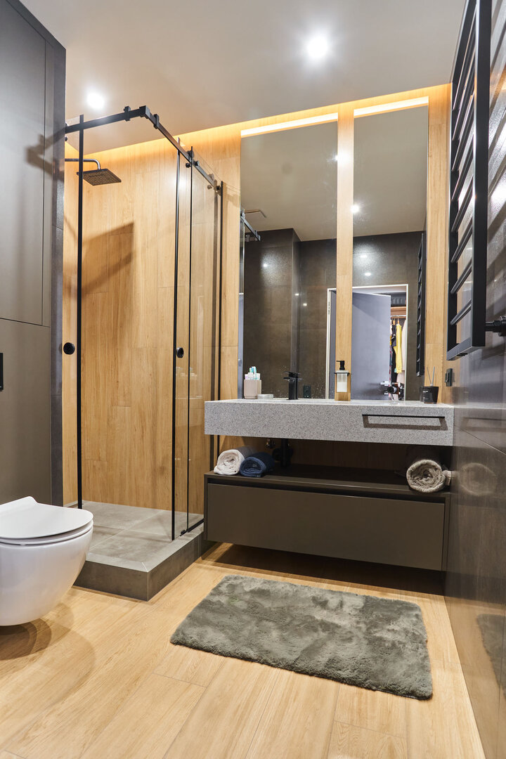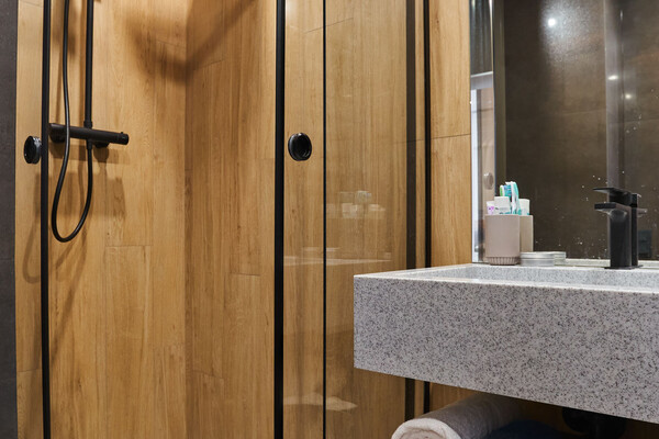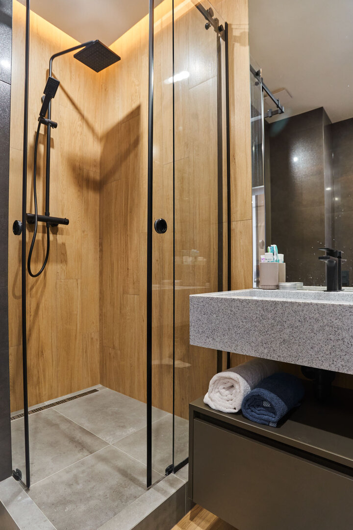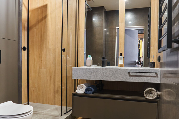Из спальни сделан вход в приватный санузел со стеклянной душевой кабиной с металлическим обрамлением черного цвета. Там также есть шкаф, где спрятан бойлер и коммуникации, а также полочки для хранения и электрический полотенцесушитель. Раковина интегрирована в акриловую столешницу.