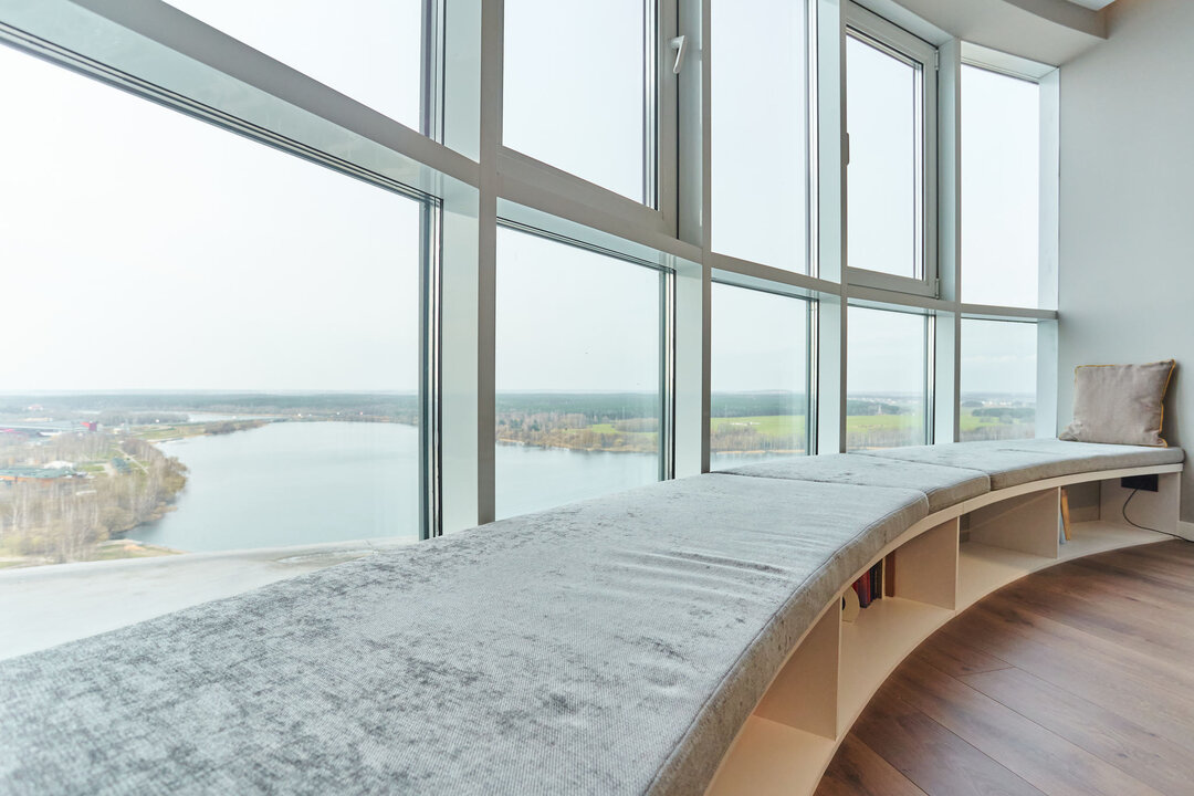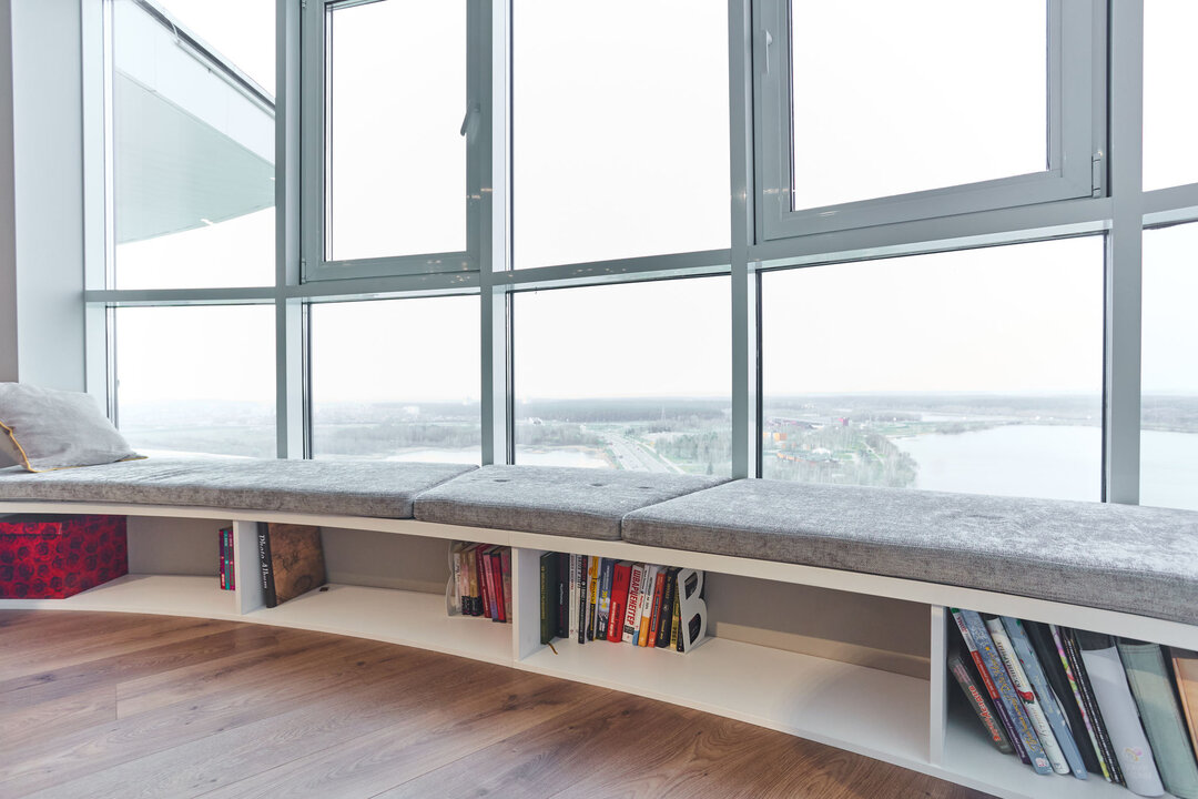Кухня-гостиная занимает более 50 метров квадратных. У окна расположена обеденная группа на четырех человек. Полукруглое окно сделано под зону для чтения. Мягкая обивка подоконника и встроенный под него стеллаж — очень сложная конструкция. Дело в том, что радиусный подоконник замерить непросто, поэтому делался шаблон и подгонялся под размер. Вообще мало производств, которые берутся за такие конструкции. Но технологи студии справлялись и с задачами куда тяжелее.