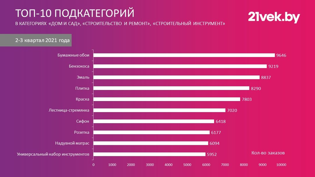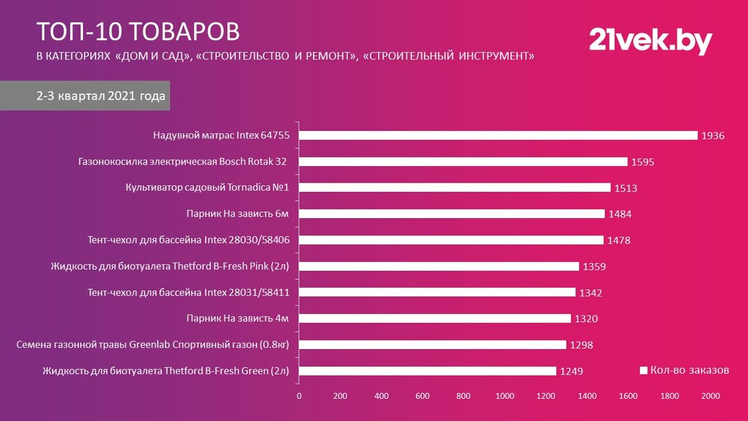 С апреля по сентябрь 2021 года 21vek.by доставил 419 960 заказов в категориях «дом и сад», «строительство и ремонт», а также «строительный инструмент». Это на 62% больше, чем в аналогичный период прошлого года. Самым популярным товаром по количеству заказов за сезон стал надувной матрас Intex 64 755, потеснивший электрическую газонокосилку Bosch Rotak 32, которая удерживала первенство в сезоне 2020.