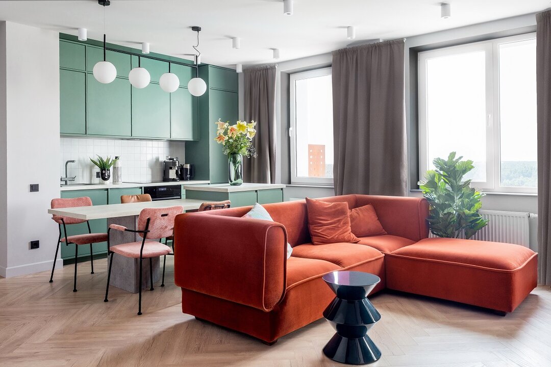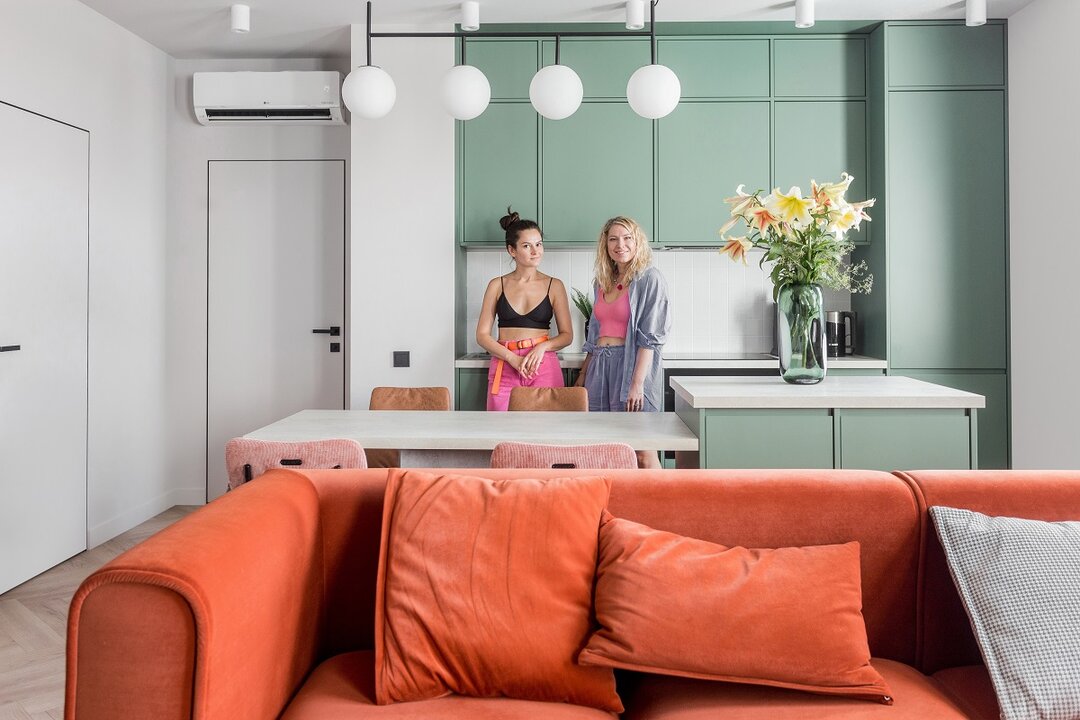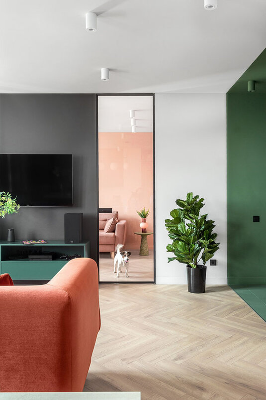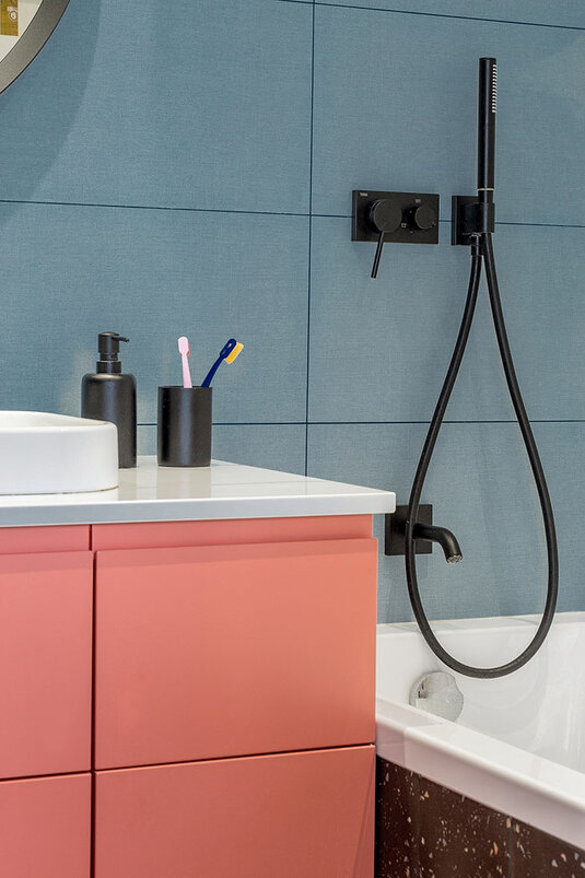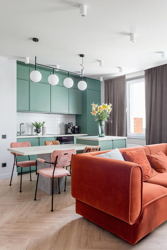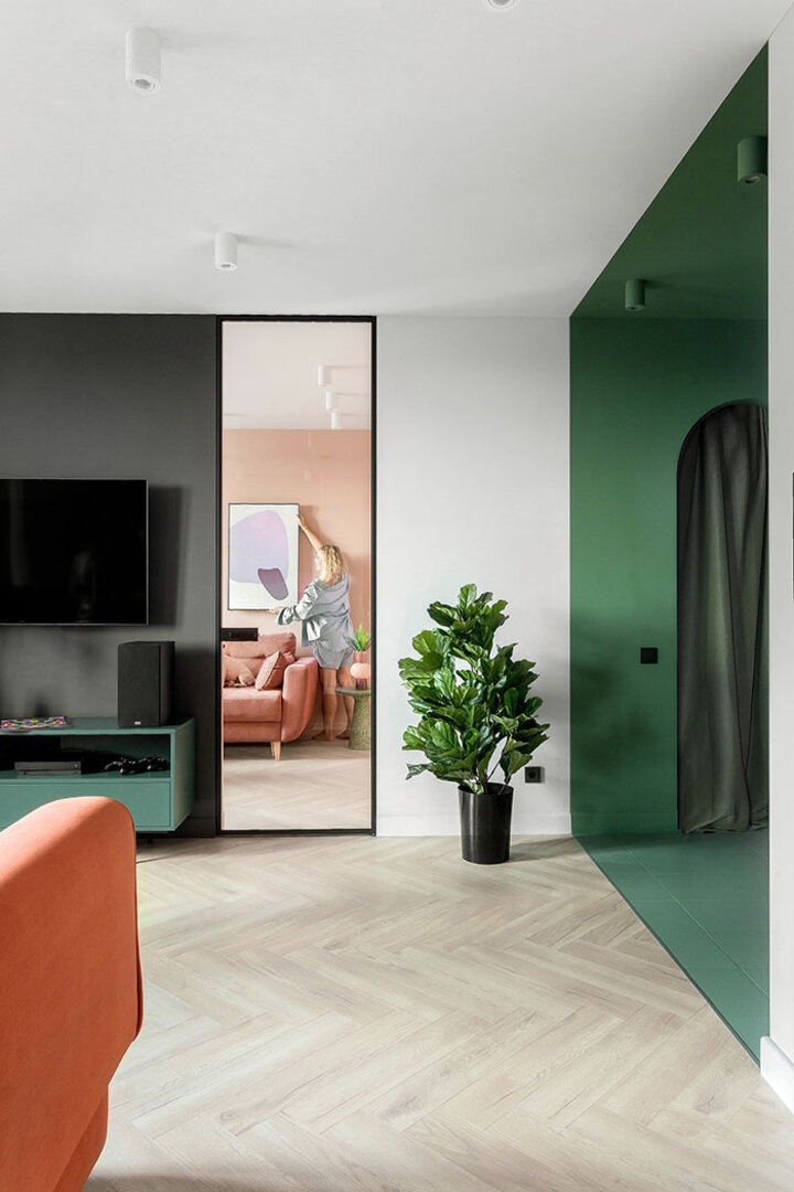 — Сделать колор-блок в зоне прихожей было хорошим решением, — считают девушки. — По планировке, попадая в квартиру, ты сразу оказываешься в гостиной. Но такой дизайнерский прием, как покраска пола, стен и потолка в один цвет, позволил психологически отделить входную зону от основного пространства и добавить интерьеру сложности.