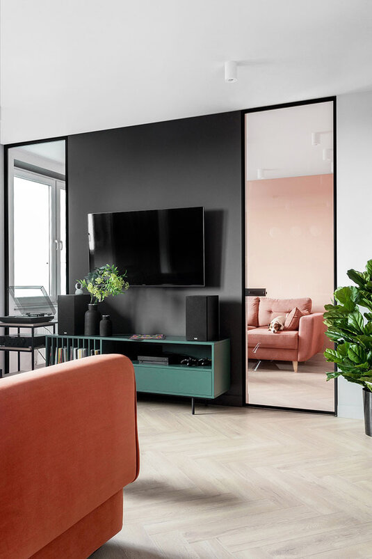 Чтобы сохранить визуальное пространство среди такого количества комнат, на стене между гостиной и кабинетом дизайнеры придумали и сделали два больших зеркальных «окна» в пол. Одно из них стало дверью, ведущей в кабинет.