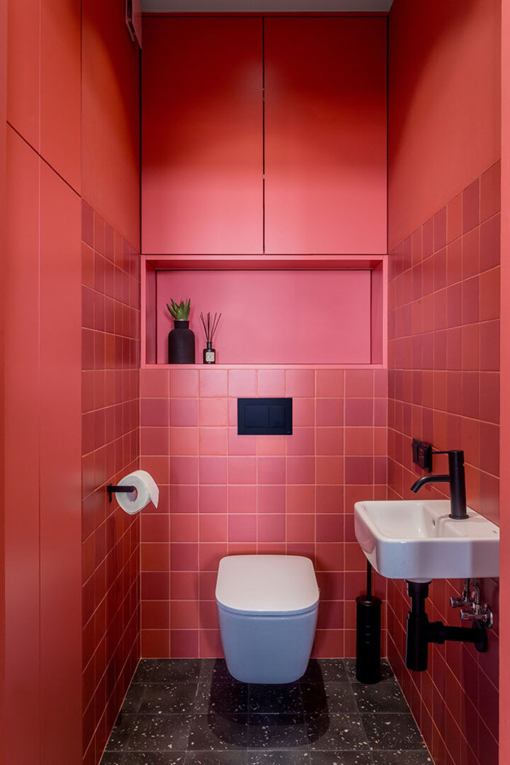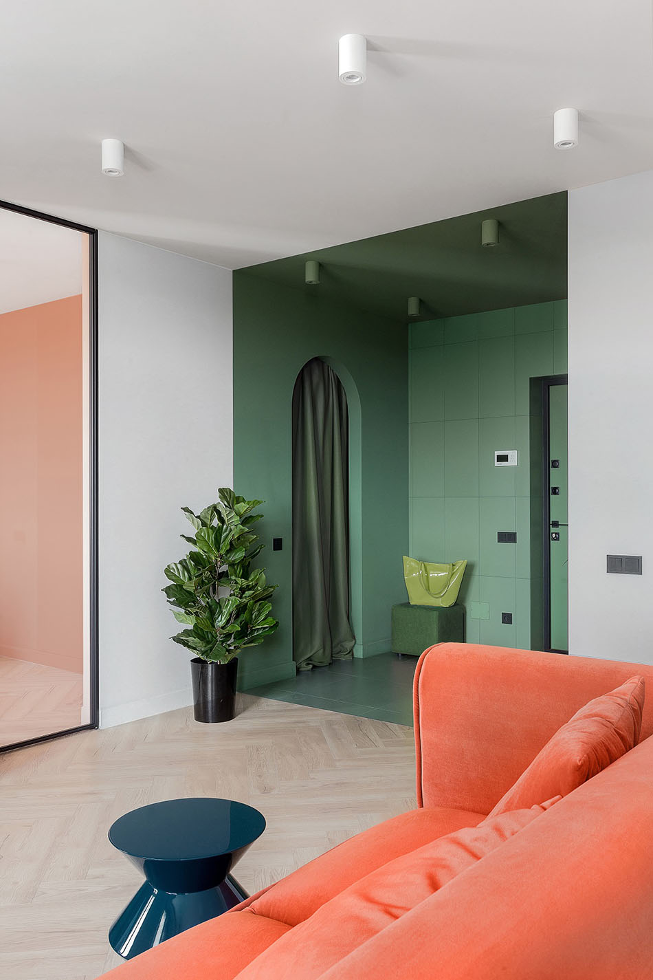 Прихожую решили отделить от основного пространства кухни-гостиной цветом — таким ярким, что даже в общественных местах такое редко встречается, не говоря уже о жилых пространствах.