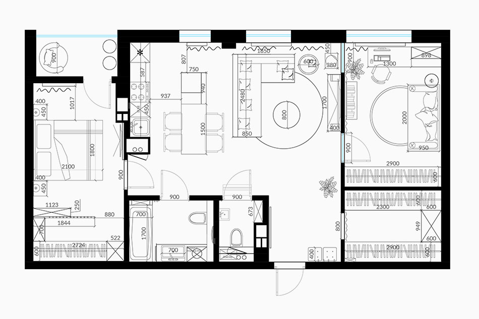 На 76 «квадратах» удалось разместить совмещенную с гостиной и кухней обеденную зону, выделить спальню и кабинет, два гардероба, прихожую и раздельные ванную и туалет.