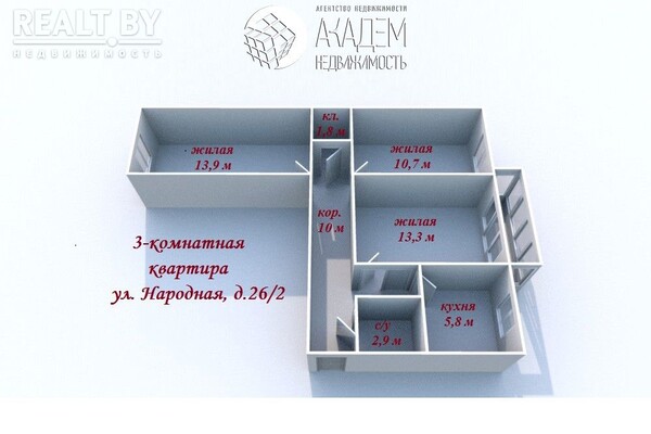 Трешка продается в доме на улице Народная, 26/2. Площадь составляет 58,5 квадратных метров (жилая — 38, кухня — 6). Располагается на пятом этаже пятиэтажного панельного дома, построенного в 1964 году.