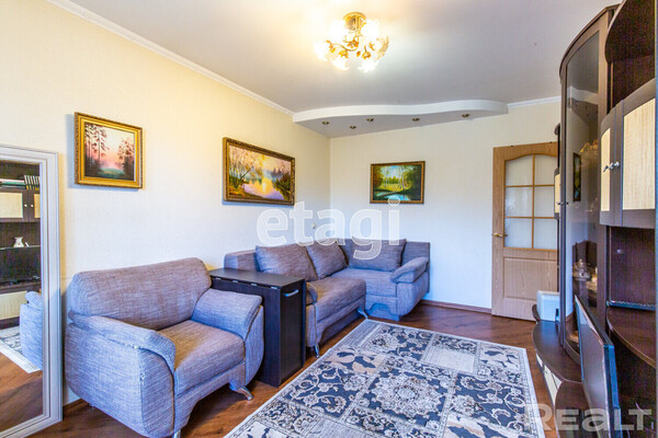Сталинка с высокими потолками занимает 48,4 м². Вытянутая кухня — 8 метров квадратных. В окнах стоят двухкамерные стеклопакеты. В санузле и ванной комнате был сделан свежий ремонт. Владельцы оставляют покупателю мебель и бытовую технику.