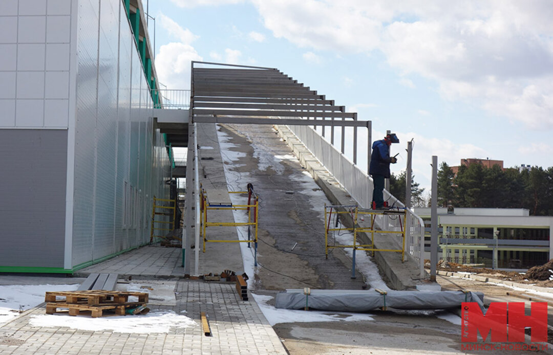 Снаружи объект кажется завершенным. Сейчас монтируются конструкции для будущего навеса над выездом из паркинга. Оказывается, на крыше тоже будет парковка.