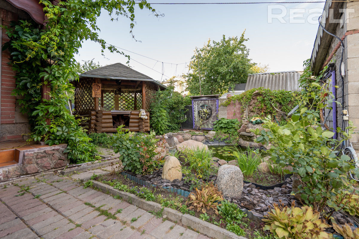 Участок огорожен забором из камня и кованки. Он просто утопает в зелени. Рядом с домом, в окружении декоративных растений находится уютная беседка для посиделок на свежем воздухе. Здесь не хватает только атмосферной и уютной садовой мебели — выбрать и купить ее можно на 21vek.by.