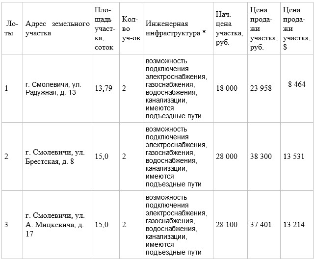 9601Сегодня состоялся аукцион по продаже земельных участков в частную собственность граждан Беларуси в Смолевичах. Потенциальным покупателям было предложено 3 земельных надела для строительства жилых домов. Торги прошли по всем лотам. Публикуем результаты.