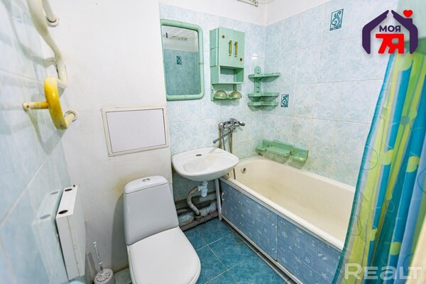 Комната в квартире проходная. Здесь есть балкон и подвальное помещение в доме. На полу лежит линолеум. Ванная и туалет совмещены.