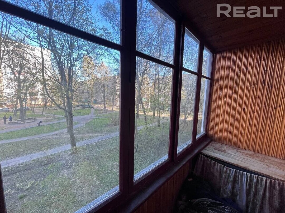 Здесь есть застекленный балкон и раздельный санузел. На окнах установлены стеклопакеты, на полу в комнатах лежат деревянные доски.