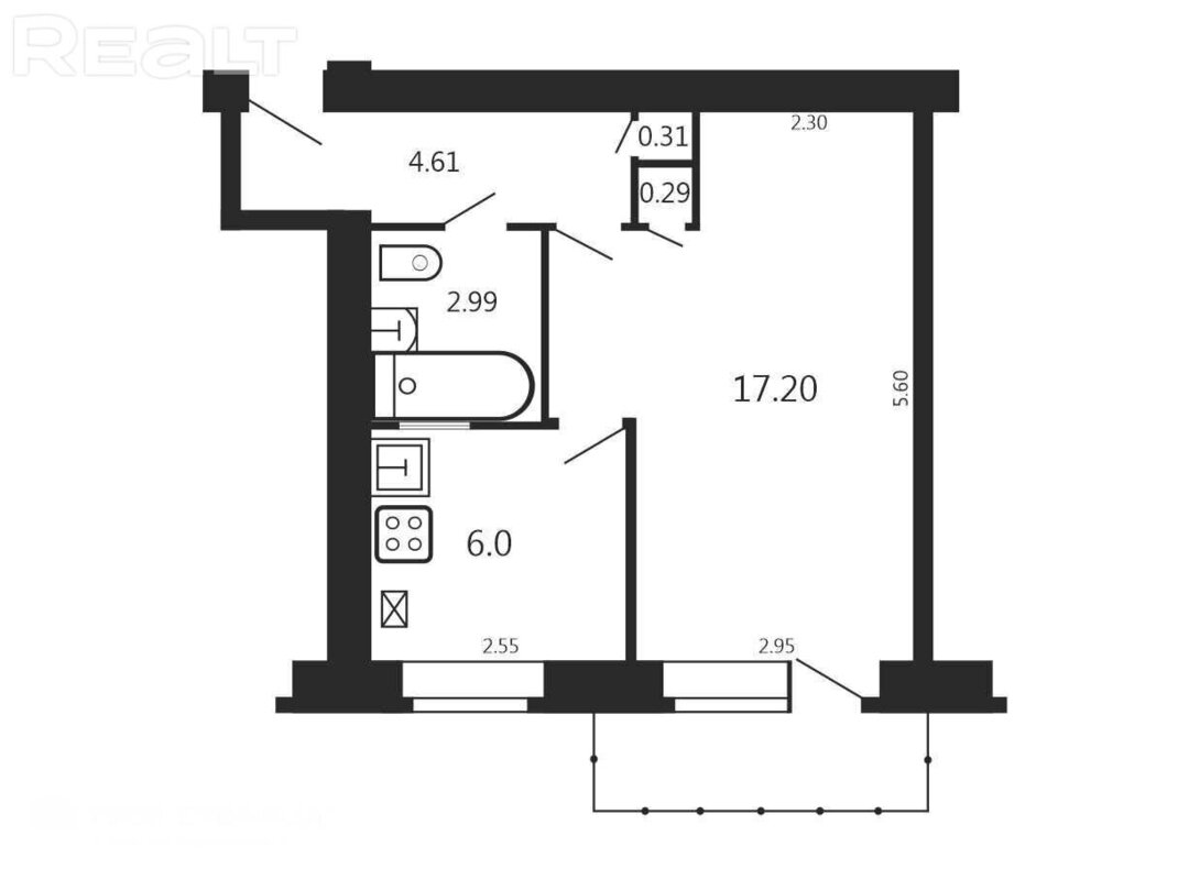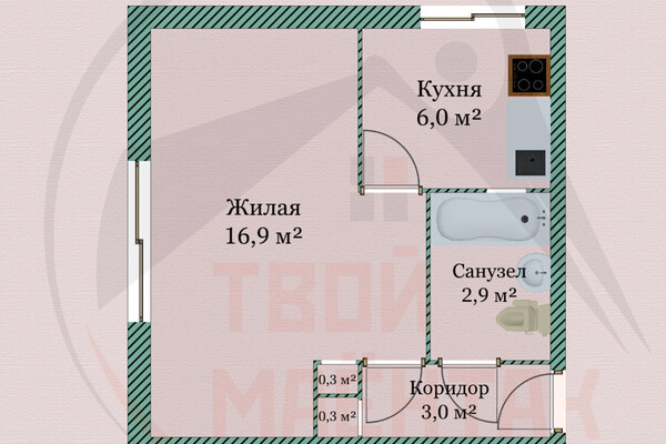 Общая площадь однушки — 29,7 м², а кухни — 6 «квадратов».