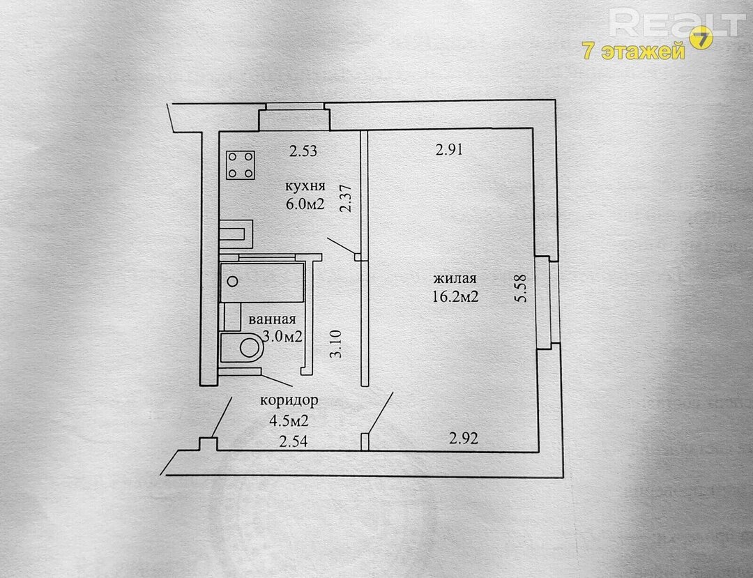 Квартира располагается в четырехэтажном доме 1958 года постройки на Толбухина, 5. Последний капитальный ремонт там проходил в 2018 году. Общая площадь квартиры — 31,58 м², а кухни — 4,81 м².