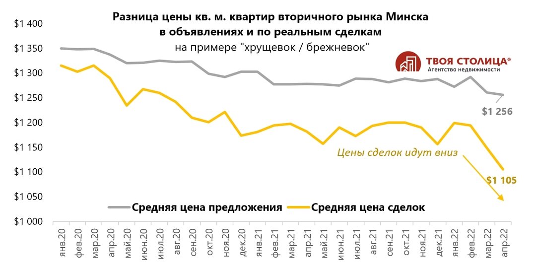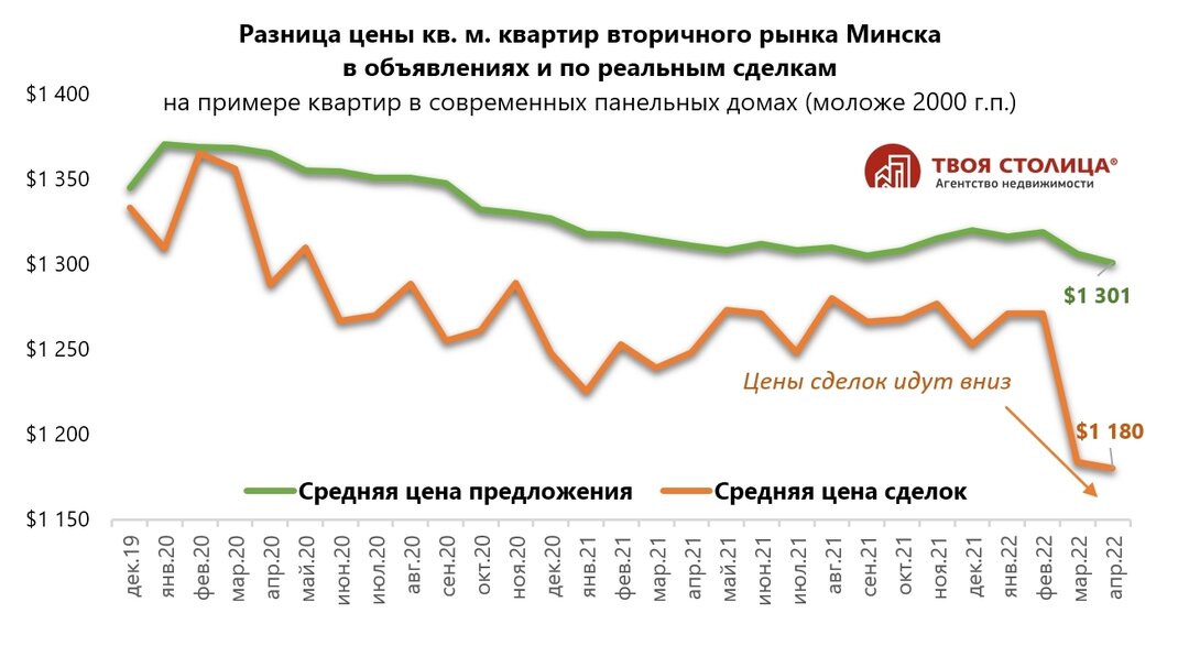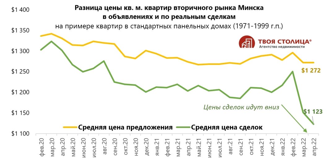 Что касается цены, то если в марте было серьезное падение (− 8%), а в апреле небольшое восстановление (+ 1%), то сейчас, я бы сказал, что рынок находится на плато. Цена колеблется то вверх, то вниз. При этом дальнейшего снижения стоимости не наблюдается. Более того, мы видим, что белорусский рубль укрепляется, а для многих покупателей − это показатель того, что дешеветь «квадраты» точно не будут.