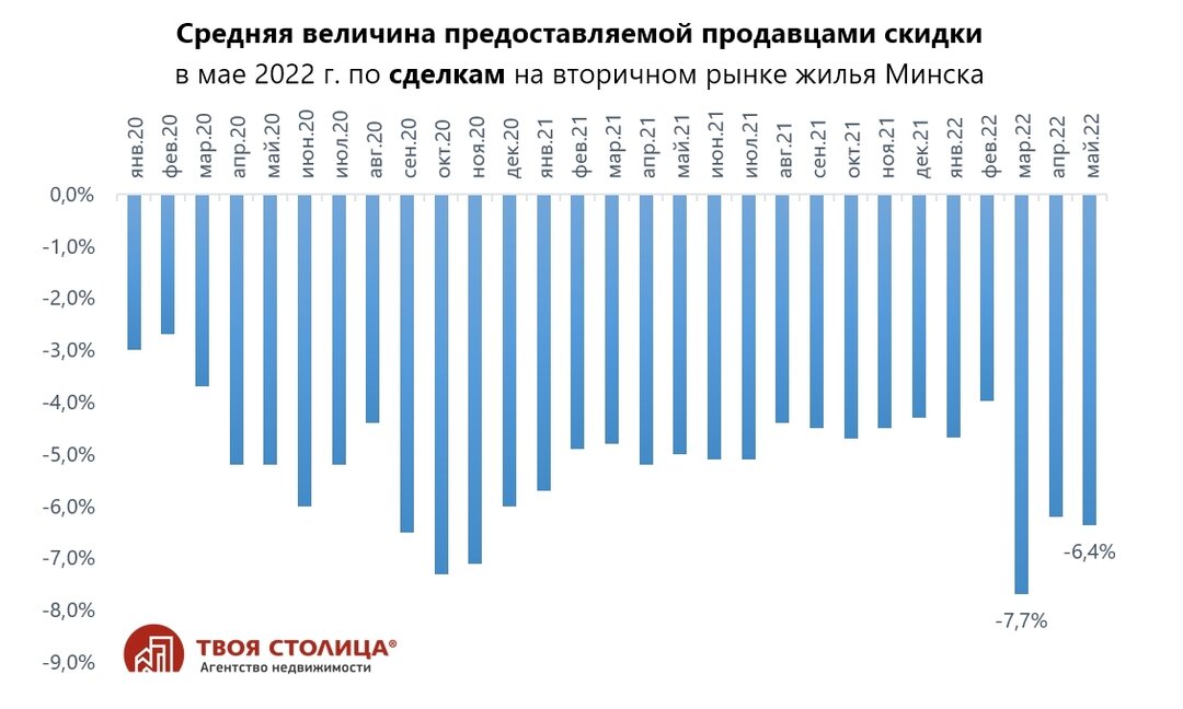 В целом, как по нашим внутренним продажам, так и по Минску, мы видим, что цены пока стабильны, а вот спрос в мае по сравнению с апрелем снизился на 4−5%. В апреле мы наблюдали небольшую волну отложенного спроса, которой хватило буквально на месяц. И даже несмотря на то, что доллар снизился — ни спрос, ни цена на это почти никак не отреагировали. Все это (наблюдаемая в мае просадка спроса, минимальный отложенный спрос и отсутствие существенной реакции покупателей на значительный откат обменного курса), наглядно иллюстрирует то, насколько финансово истощены сегодня покупатели. Что подтверждается и ценами сделок, которые после мартовского снижения не только закрепились там, но и продолжают испытывать тяготение в сторону снижения из-за значительного превышения количества предлагающихся на продажу квартир по отношению к количеству финансово обеспеченных покупателей. При этом, по ценам предложения продажи (заявляемых в объявлениях) этого можно и не увидеть — продавцы просто предоставляют все большую скидку реальным покупателям. Поэтому совет для покупателей прежний — предлагайте свою цену, какой она бы ни была по отношению к первоначально заявляемой продавцом.