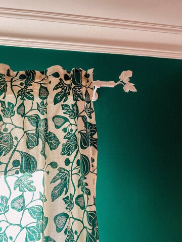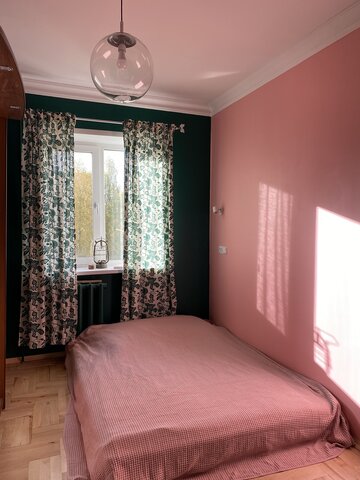 В спальне пока не хватает основания для кровати и нового шкафа для одежды. А вот выбору глубокого зеленого цвета для стен Тома очень рада — говорит, каждое утро как будто просыпаешься в лесу. Чуть позже девушка хочет расписать и розовую стену — «но это пока не срочно».