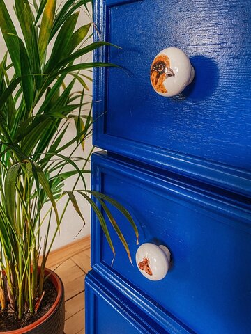 — Мне в инстаграме часто пишут: «Ой, а у нас такой же комод!», — улыбается девушка. — Это абсолютно обычная старая модель — может, «Пинскдрев» какой. Мы добавили к нему ножки и покрасили такой же краской, как панели на кухне. Ручки заказали керамические ручной работы.