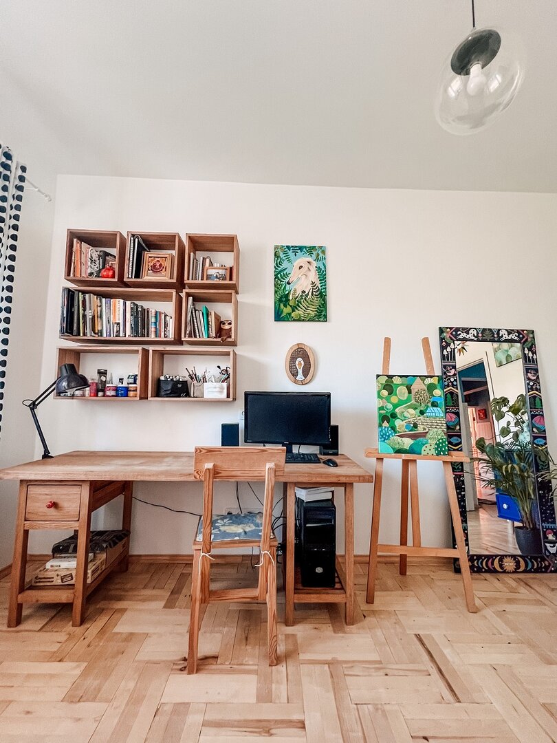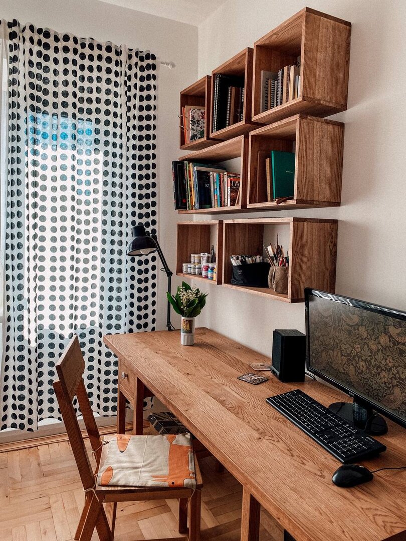 Всю мягкую мебель пара заказывала у беларуского бренда, а рабочее место для Томы полностью обустроил муж — сделал стол, стул и полочки.