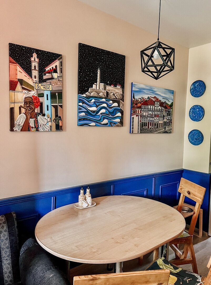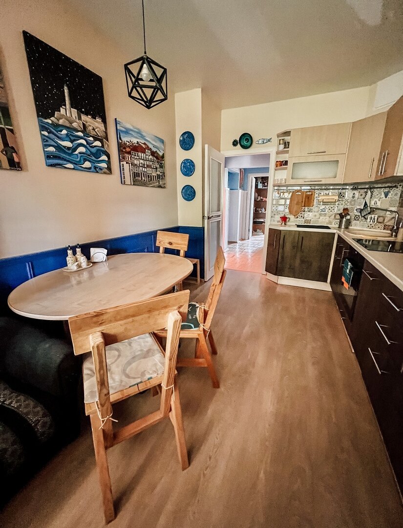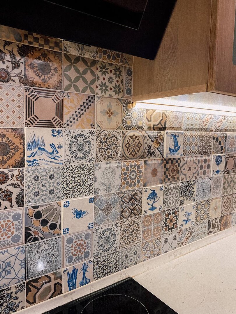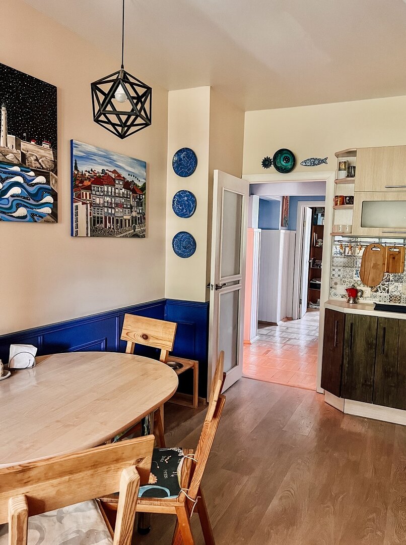 Со временем цвета в квартире только прибавляется. Например, на кухне появились яркие синие стеновые панели, которые давно хотелось — Артем выпилил их сам. «Нам очень понравилось, как получилось. Немного в стилистике португальского кафе».