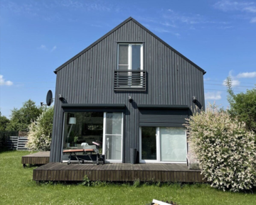 Дом возводили в скандинавском стиле. Планировка такая: две спальни, кухня, гардеробная, кабинет и совмещенный санузел. Каждая зона имеет свой цвет стен. На первом этаже есть выход на террасу. Дом продается с мебелью и бытовой техникой и подходит для круглогодичного проживания: вода поступает из скважины, введена канализация, есть электрическое отопление.
