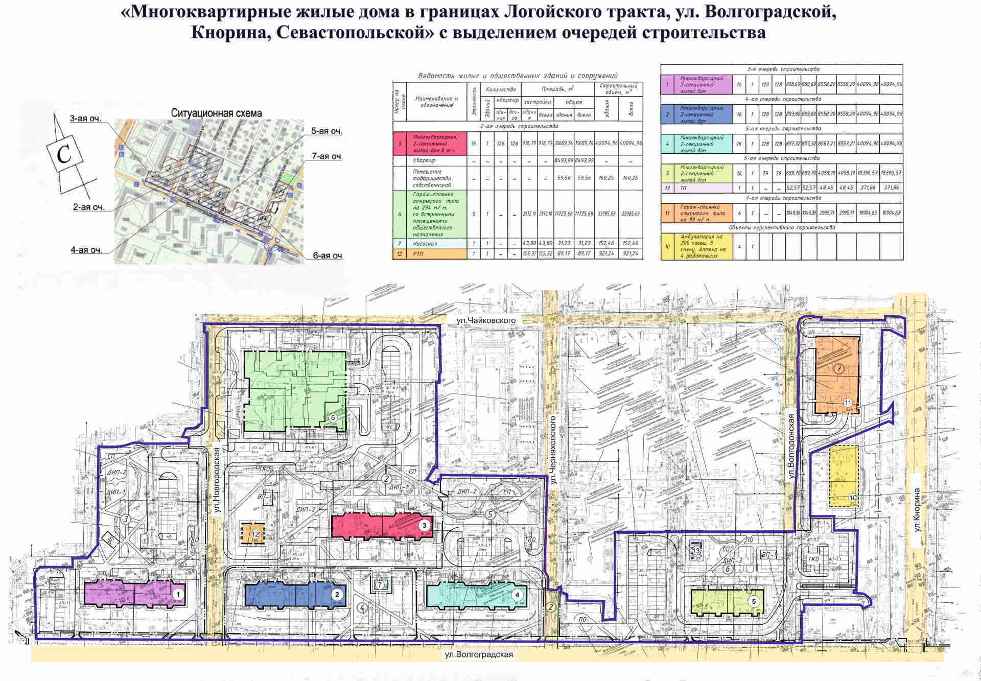 О строительстве многоэтажек на Волгоградской заговорили еще в январе 2021 года. Тогда администрация Первомайского района заявила, что осваивать площадку под строительство будут два УКСа — Центральный и Советский. Вместе они построят шесть жилых домов. Летом прошлого года участок улиц Волгоградская— Кнорина — Севастопольская — Логойский был огорожен. Там появилась специальная техника и паспорт, где было сказано, что идут подготовительные работы, а заказчиком является только УКС Центрального района. У итоге на территории появится пять высоток, два паркинга и амбулатория. Строительство многоэтажек и гаражей-стоянок разделили на 7 очередей.
