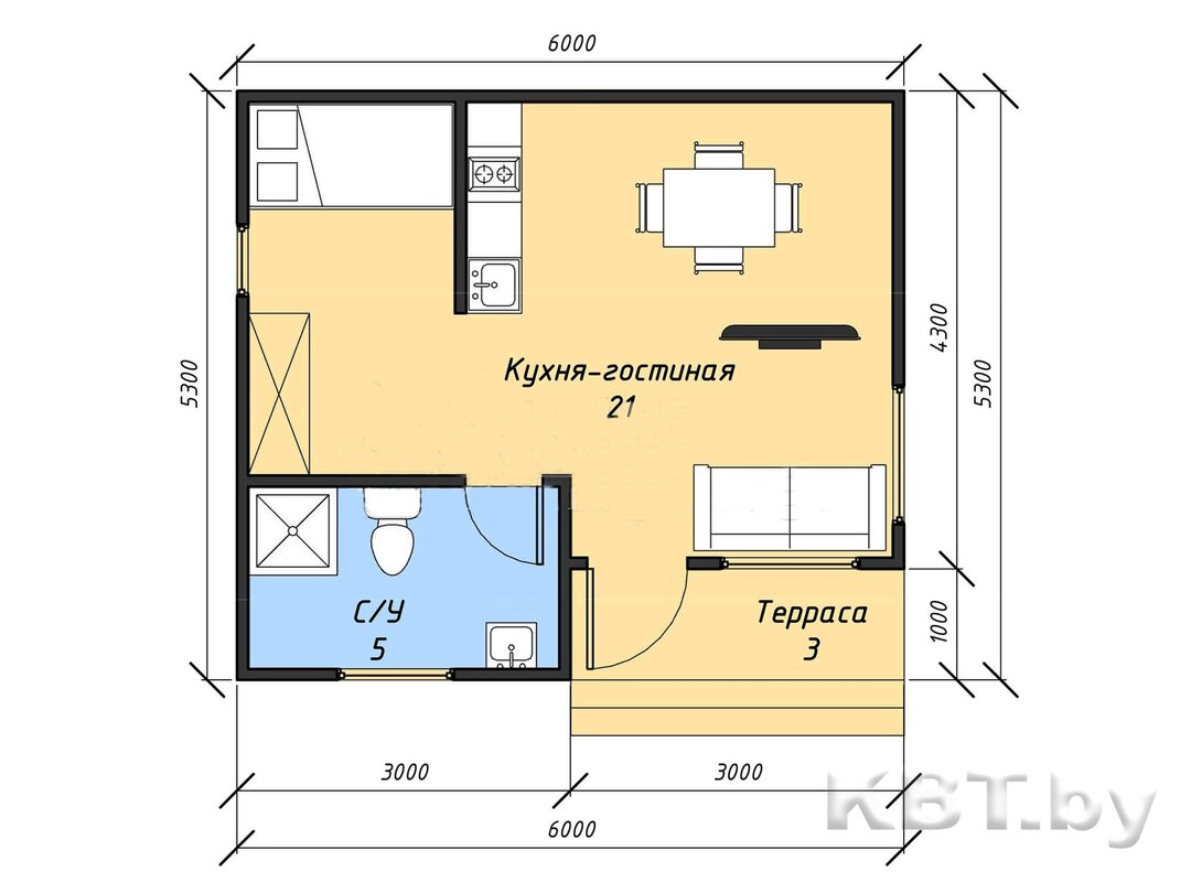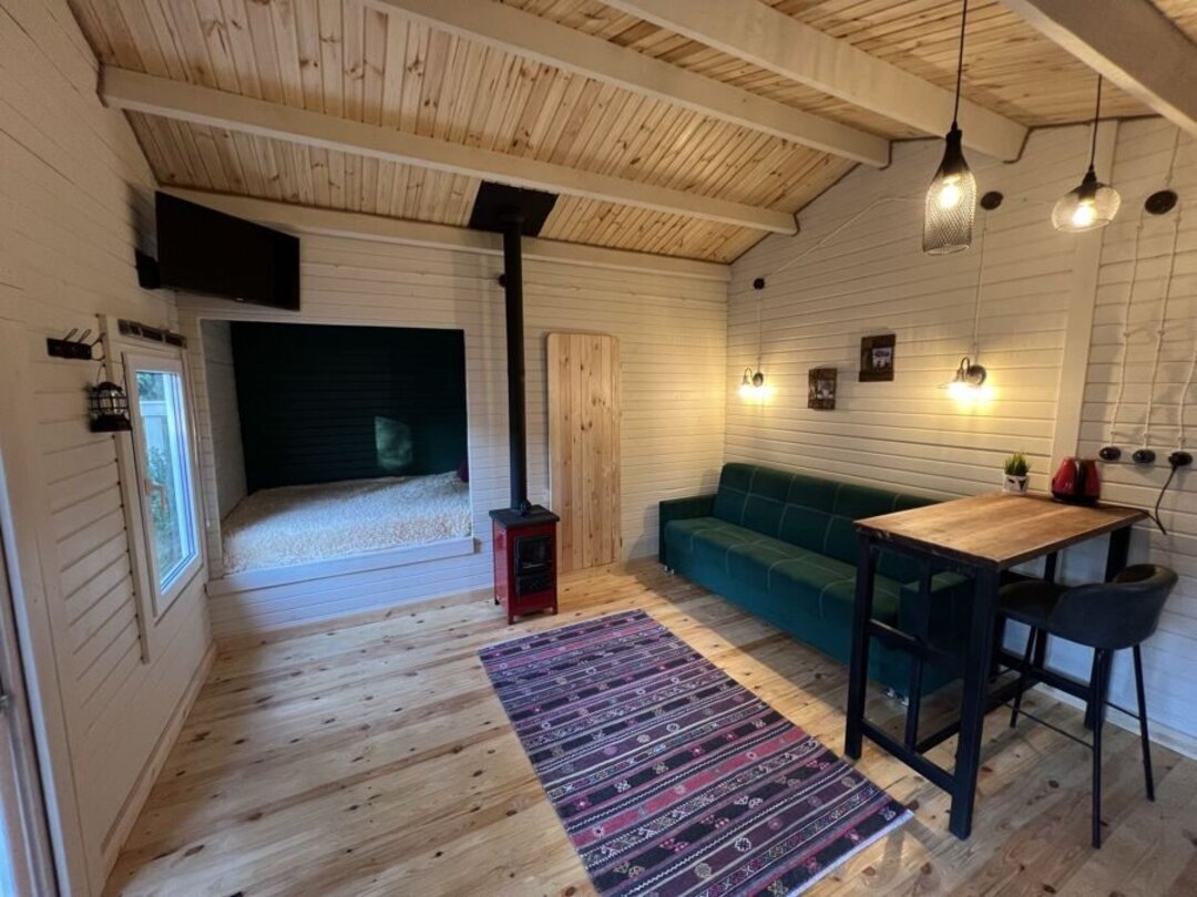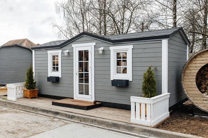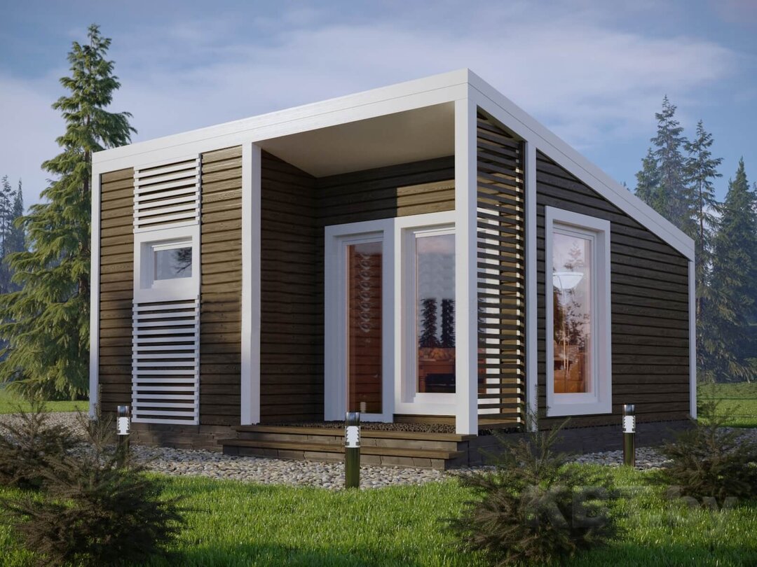 В доме побольше, на 27 м2, у входа под навесом находится просторная терраса. Внутри большая комната и санузел. Полный домокомплект стоит 3490 долларов.