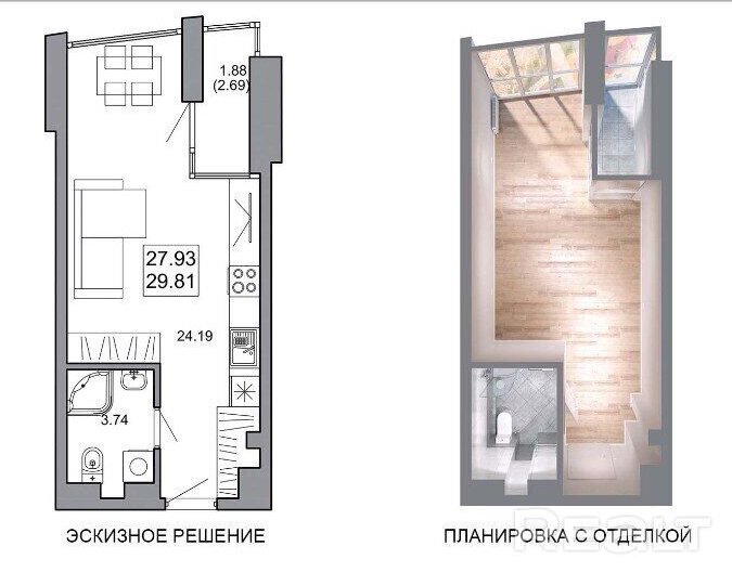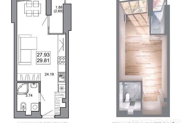 В этой студии в доме «Хельсинки» на проспекте Мира, 12 меньше 30 квадратных метров общей площади. Квартира прямоугольной формы, кухня и комната находятся вместе. Отдельно на планировке можно рассмотреть санузел и ту самую лоджию. Особенность в том, что она находится не вдоль стены с окном, а справа от нее.