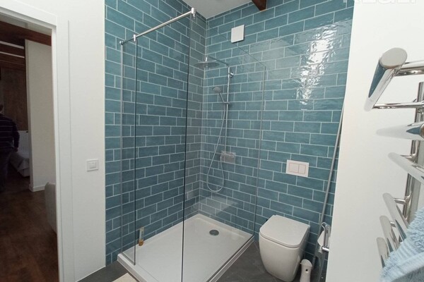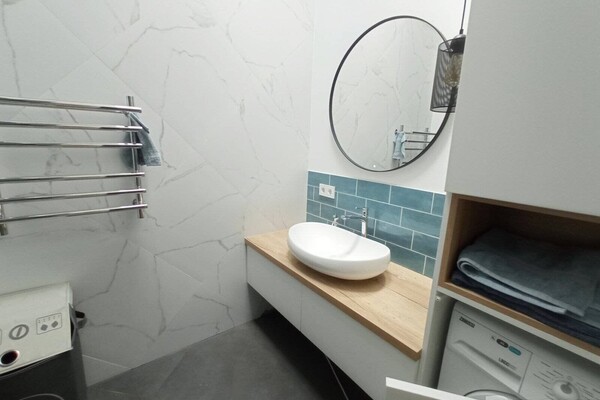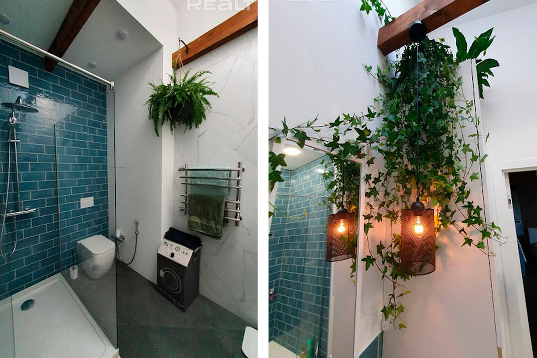 Санузел в квартире совмещенный. Установлена душевая кабина, бойлер и стиральная машина. На полу лежит керамогранит с подогревом. Главная фишка ванной комнаты — открывающееся окно в потолке.