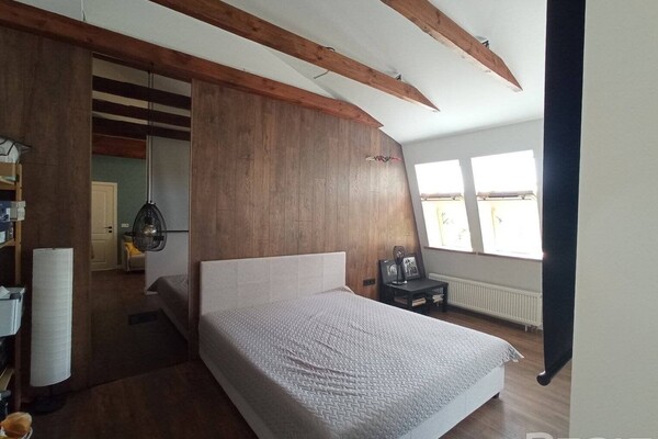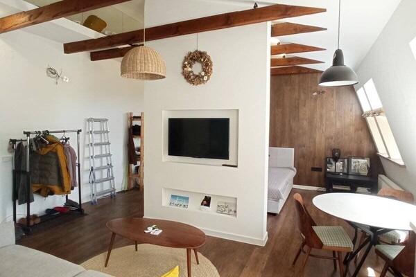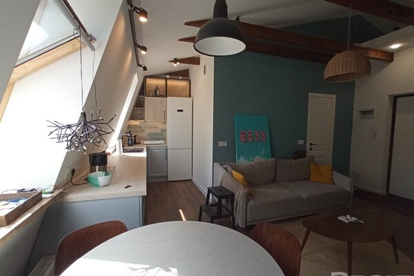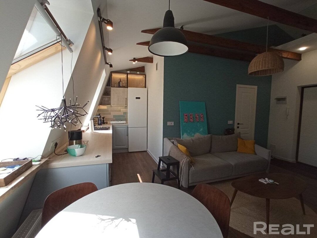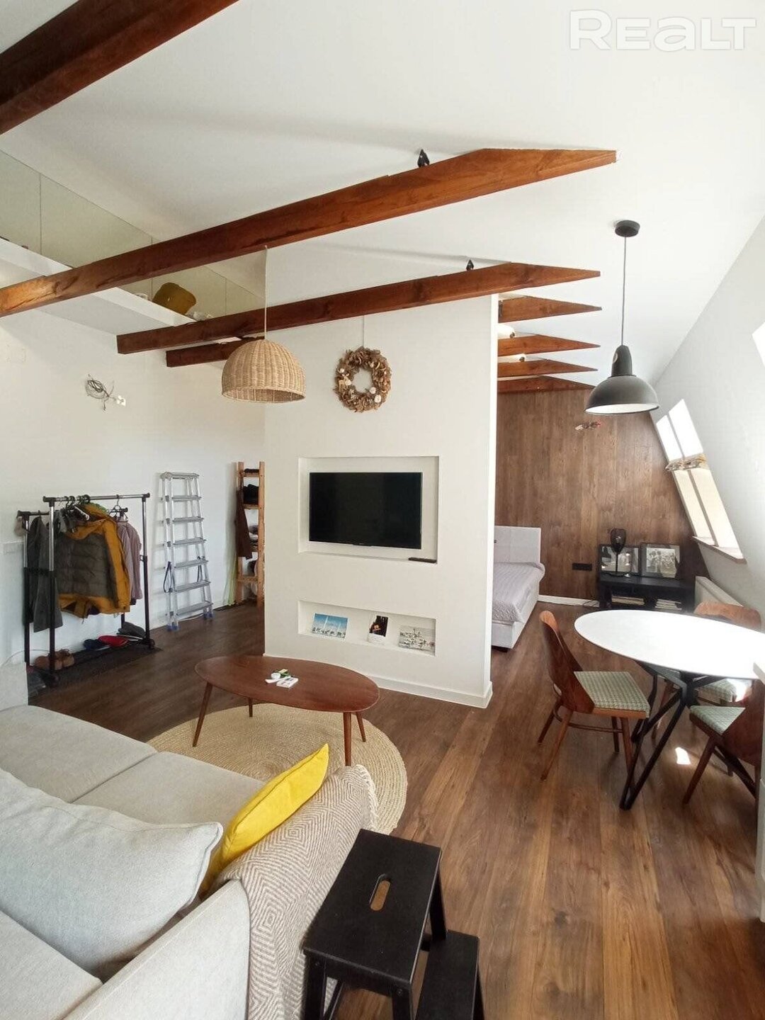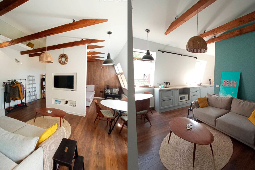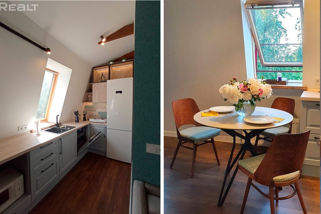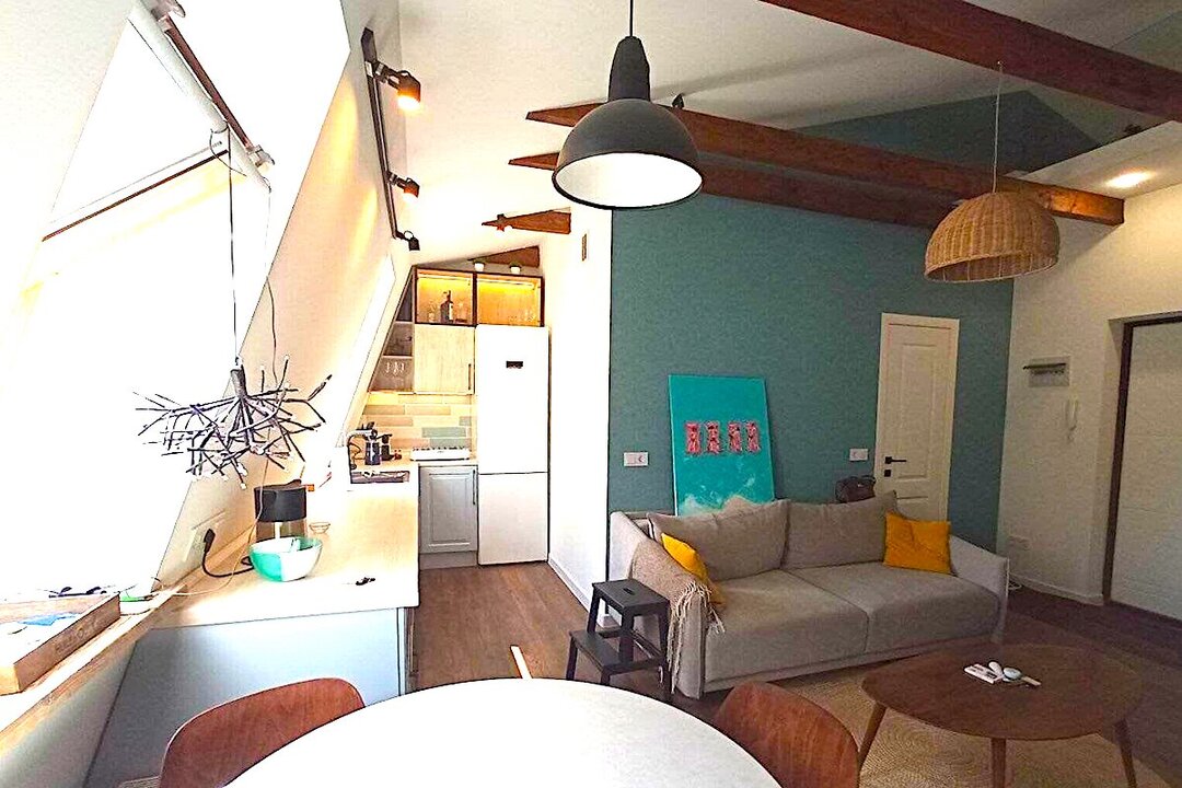 7339В базе Realt появилась нестандартная квартира с мансардой, высокими потолками и приятным ремонтом. На потолке в жилых комнатах балки, а в санузле — окно, из которого открывается вид на небо. Стоит эта квартира относительно недорого, метр выходит около 1 500 долларов. Показываем.
