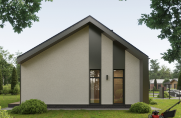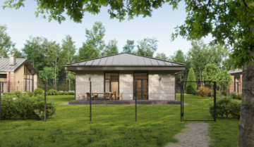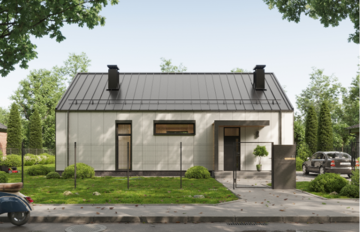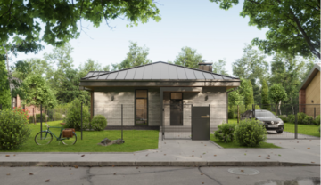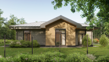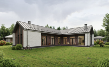 Этот дом самый большой из представленных ныне застройщиком — 164 квадратных метра. Застройщик говорит, что этот коттедж впитал в себя все лучшие элементы от предыдущих типов. Он имеет Г-образную форму, образуя собой закрытое внутреннее дворовое пространство. Такая форма позволяет удобное разделить зоны спальни и общие помещения.