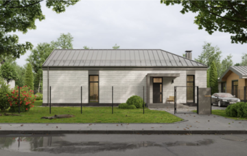 Планировка дома в 138 квадратных метров предполагает 2 обособленные жилые комнаты, кухню-гостиную совмещенную с 3 жилой комнатой. При этом ее можно отделить перегородкой. Высота потолков здесь достигает 3,4 м. В проекте обустроен дымоход для камина. Терраса объединяет жилую комнату и гостиную с наружной стороны дома.