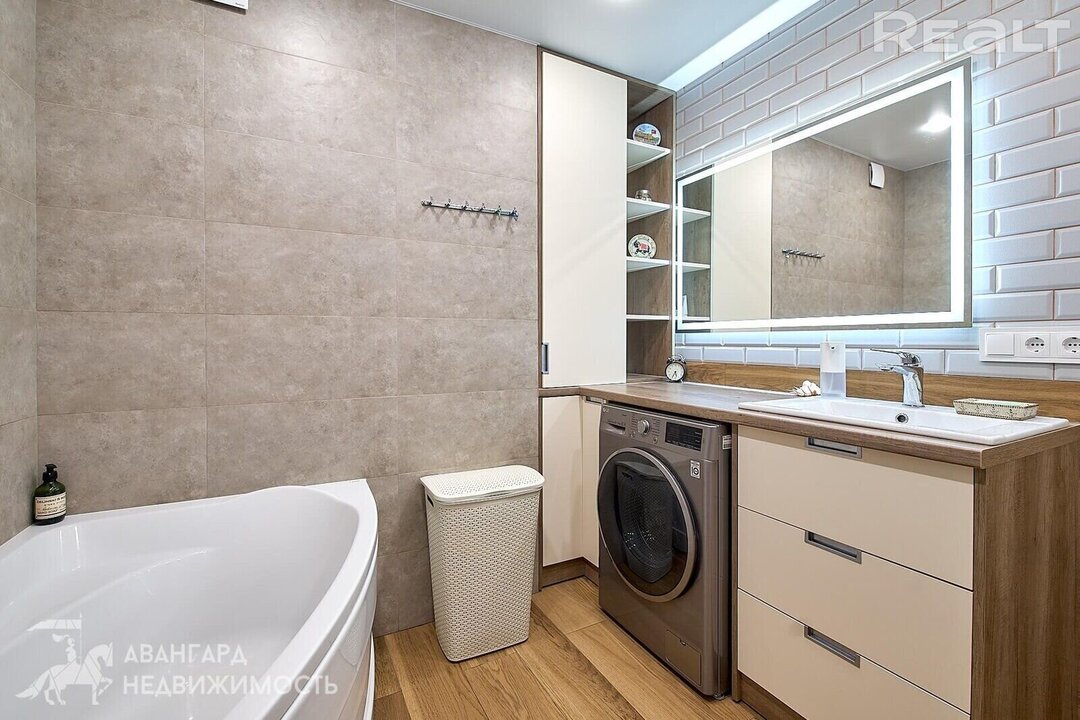 Стены выровнены и оклеены обоями. Во всех жилых комнатах уложен ламинат, в кухне — плитка. Зона приготовлении еды также оснащена встроенным кухонным гарнитуром с варочной панелью, многофункциональным духовым шкафом и мощной вытяжкой.