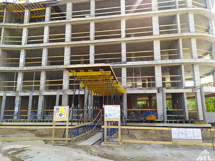 — Уже завершили устройство плиты перекрытия над пятым этажом и перешли к монтажу опалубки на шестом. На объекте работают два крана и порядка 80 человек. Параллельно с возведением монолитного каркаса каменщики ведут кладку внутренних перегородок и наружных стен первого этажа, — рассказали в «Минскстрое».
