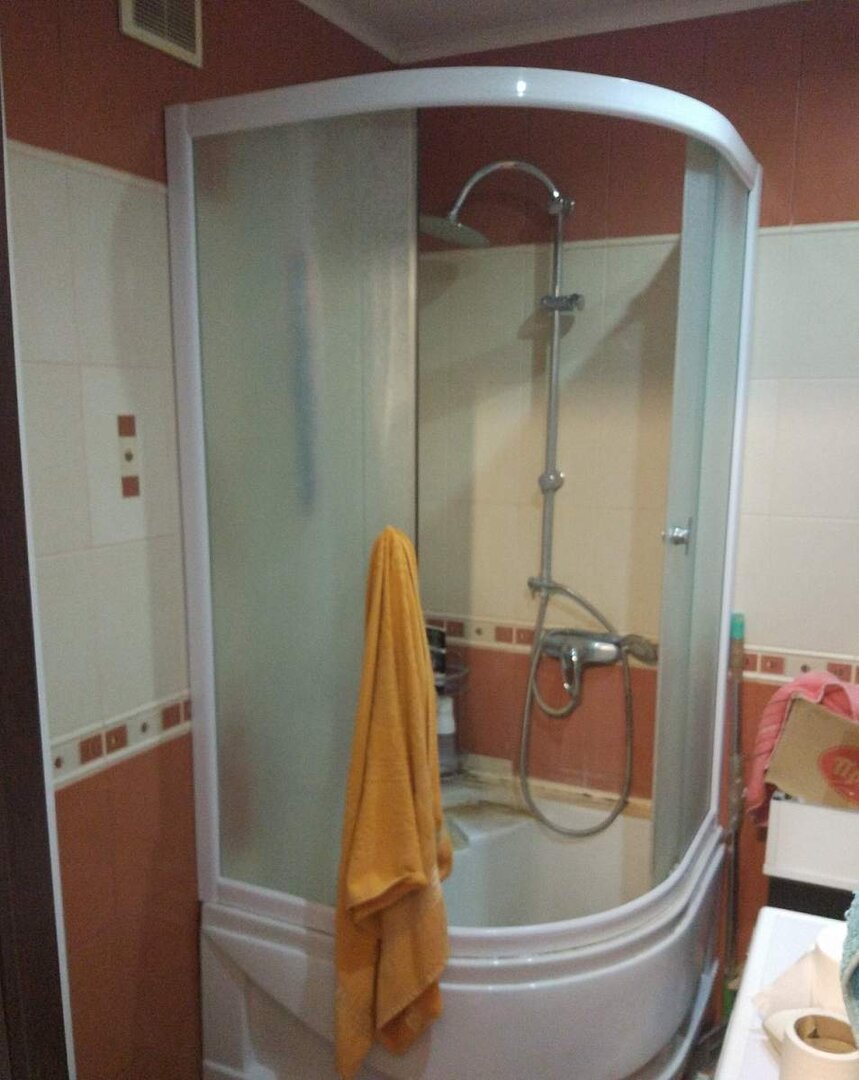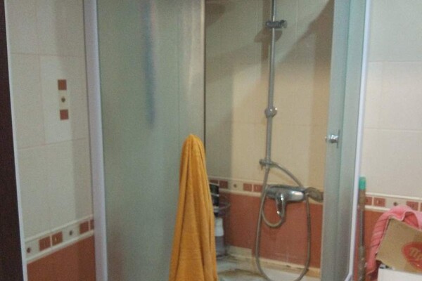 Судя по фотографиям, в квартире есть внутренняя отделка. Можно заметить обои, застекленный балкон, встроенный шкаф, кухню и душевую кабину.