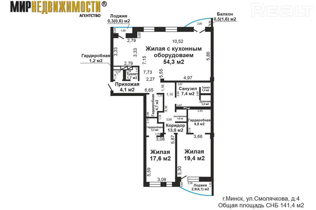 Дом находится на Смолячкова, 4. Его построили в 2013 году в 7 этажей. Трешка располагается на пятом этаже и занимает 141,4 м².