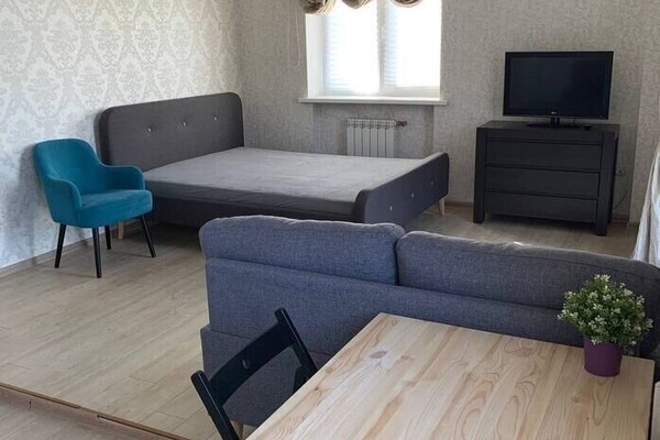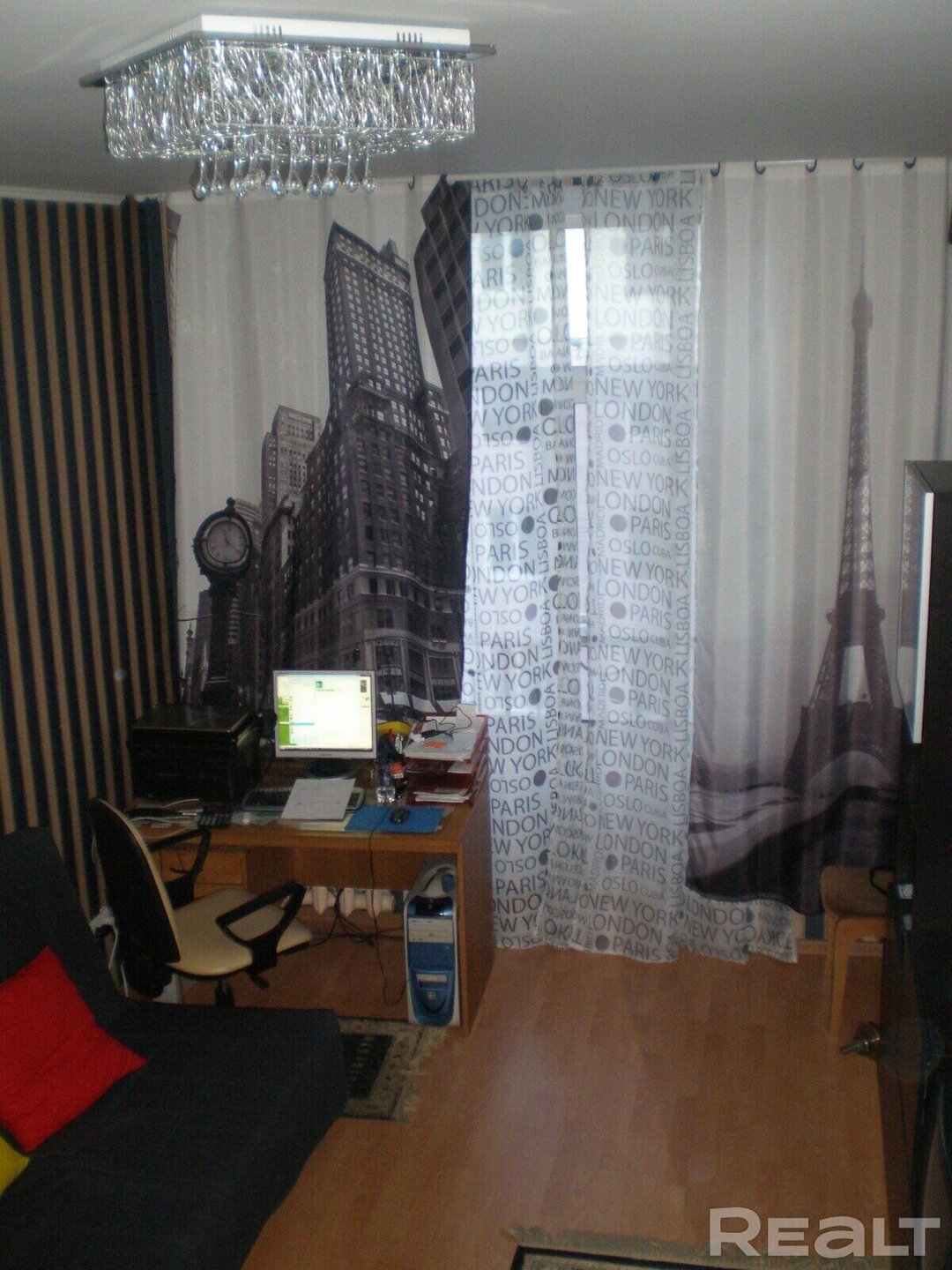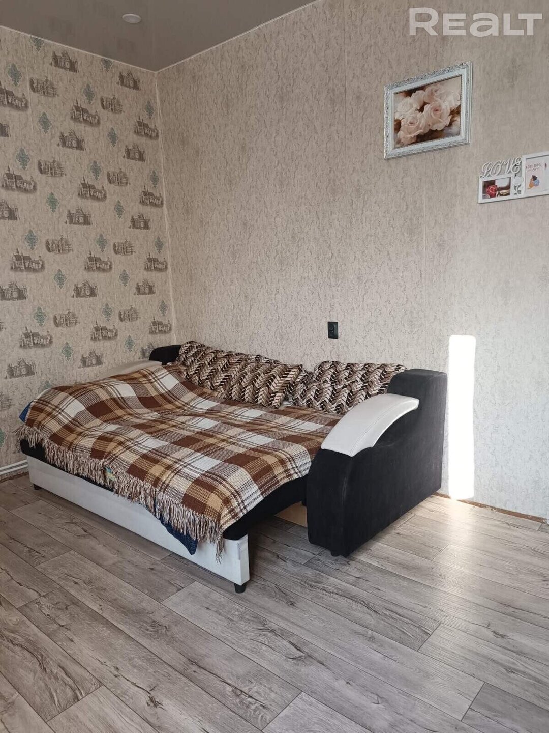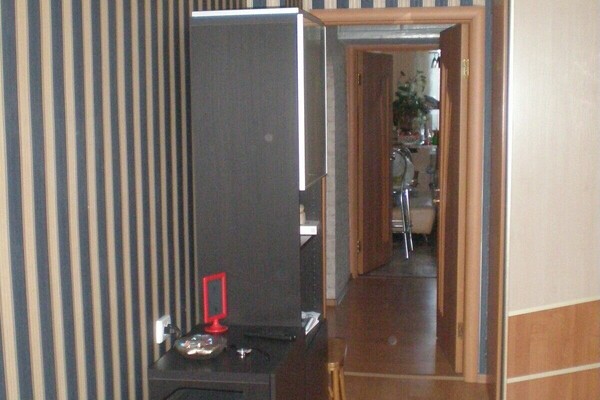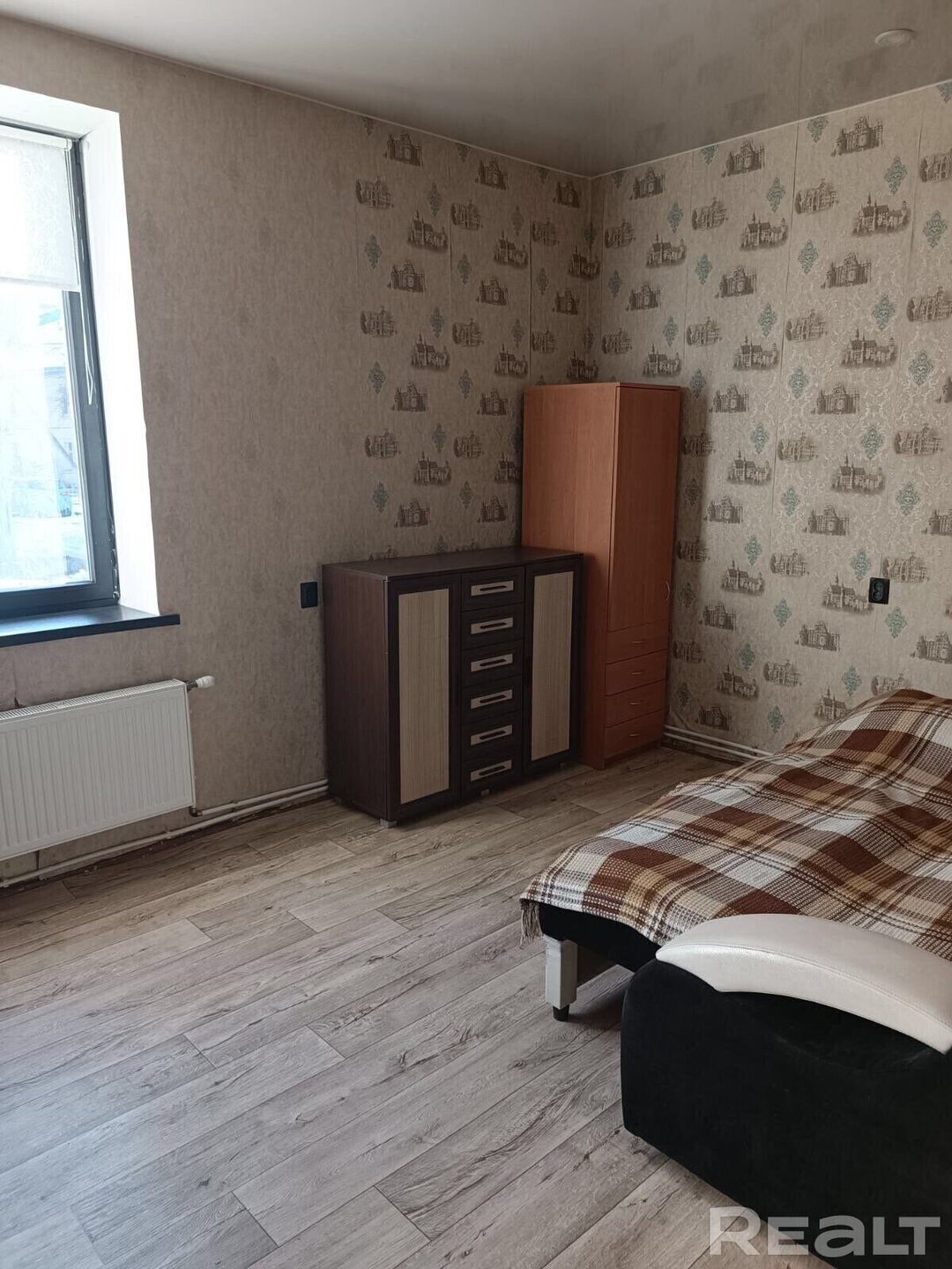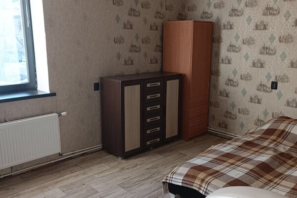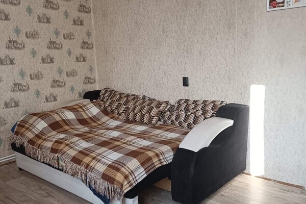 Квартира находится на первом этаже. В ней 26 «квадратов» общей площади. Жилая — чуть меньше 16. Высота потолков — 3,3 метра. В жилой комнате установлен шкаф-купе, есть спальное место. Окна комнаты выходят на юг. Установлены стеклопакеты. На полах лежит доска, покрытая линолеумом. Потолки во всей квартире натяжные.