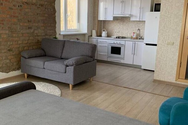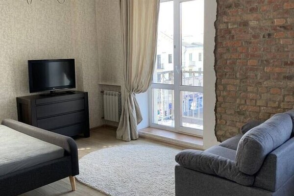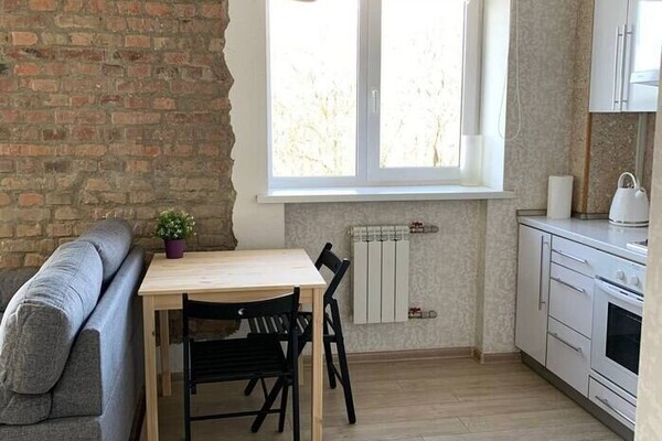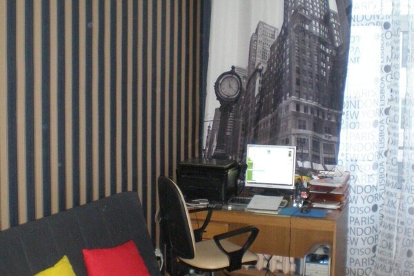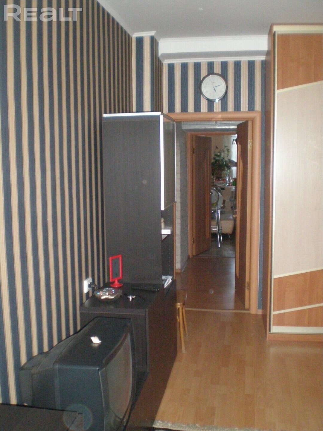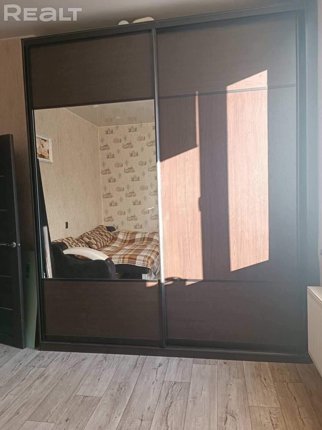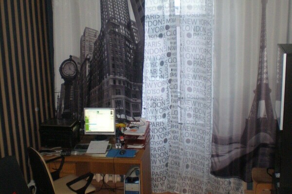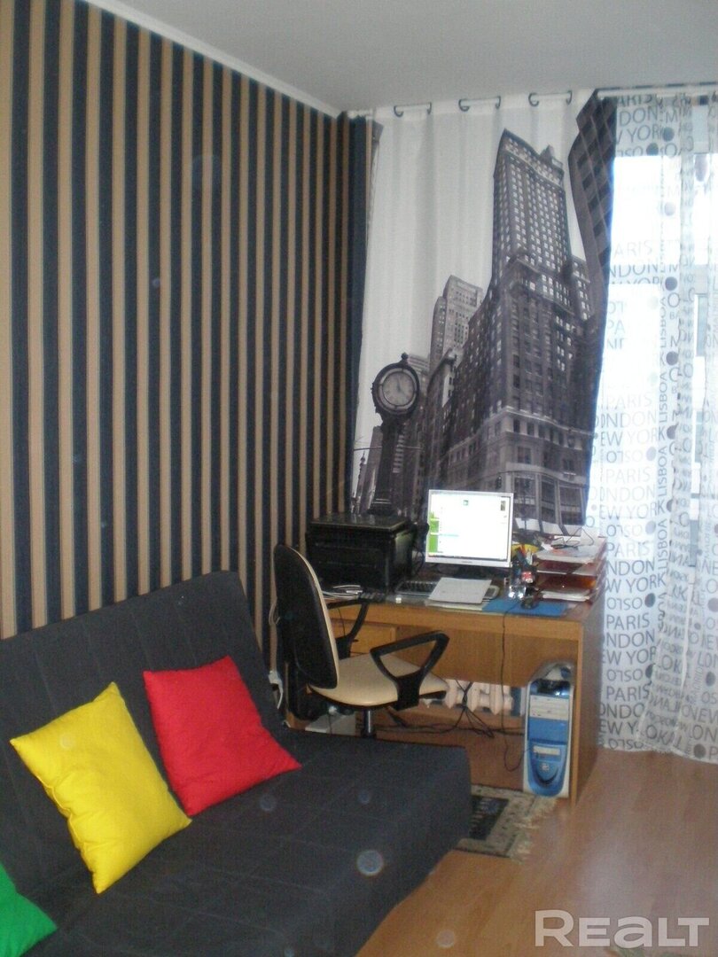 Квартира находится на первом этаже. В ней 26 «квадратов» общей площади. Жилая — чуть меньше 16. Высота потолков — 3,3 метра. В жилой комнате установлен шкаф-купе, есть спальное место. Окна комнаты выходят на юг. Установлены стеклопакеты. На полах лежит доска, покрытая линолеумом. Потолки во всей квартире натяжные.