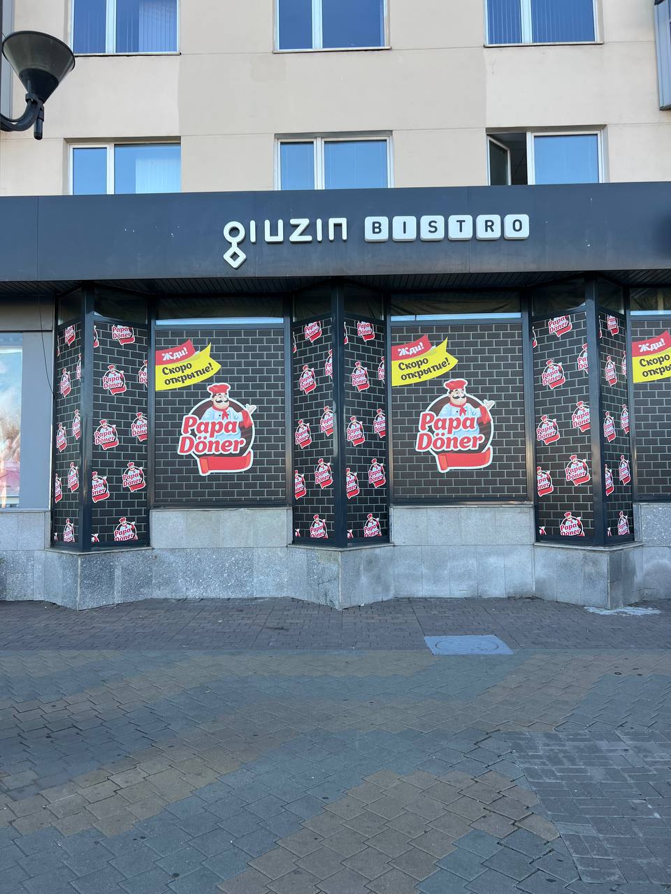 2066Gruzin bistro на проспекте Победителей, 5 закрылось. Теперь на этом месте растяжка о скором открытии Papa Doner. Фото публикует Кокобай.