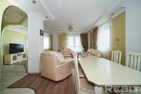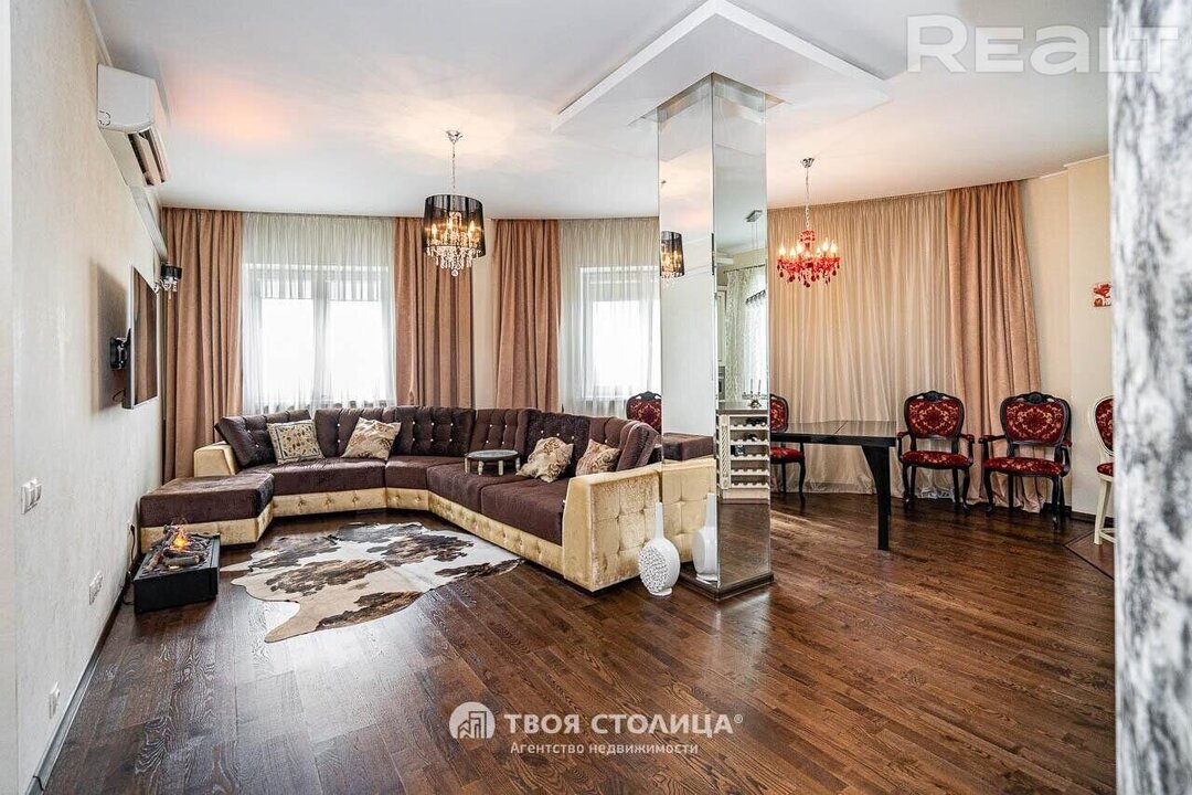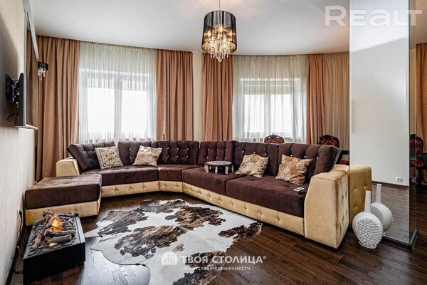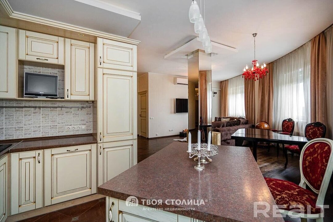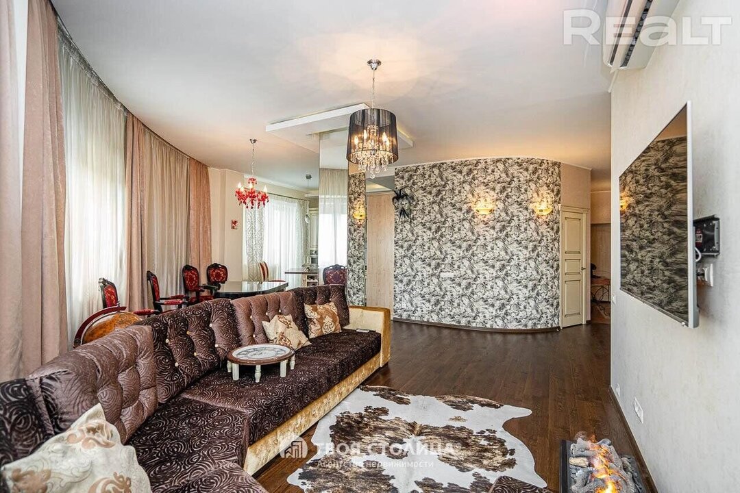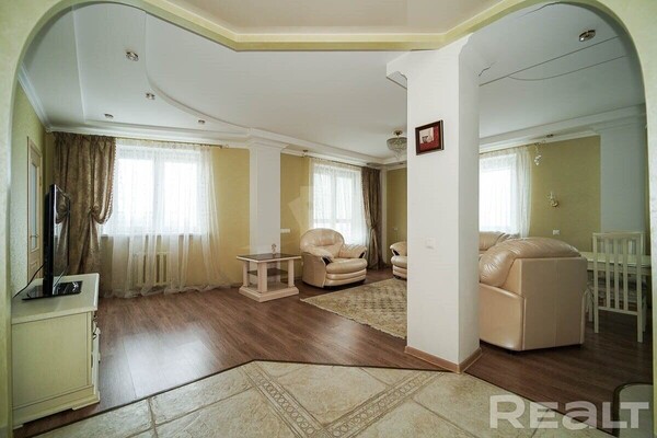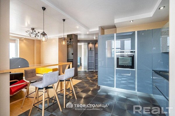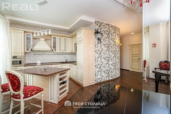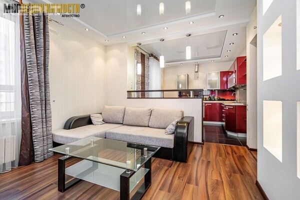 Также в доме продается интересная трехкомнатная квартира. Ее площадь составляет 100 квадратных метров. Квартира состоит из кухни-гостиной и двух жилых комнат. Ремонт в этом жилье выполнен по индивидуальному дизайн-проекту. В квартире можно заметить колонны, люстры, разноуровневые потолки. Вся мебель и техника остается новым владельцам. Стоимость — 155 тысяч долларов (1544 доллара — за метр).