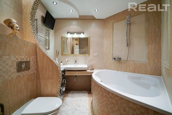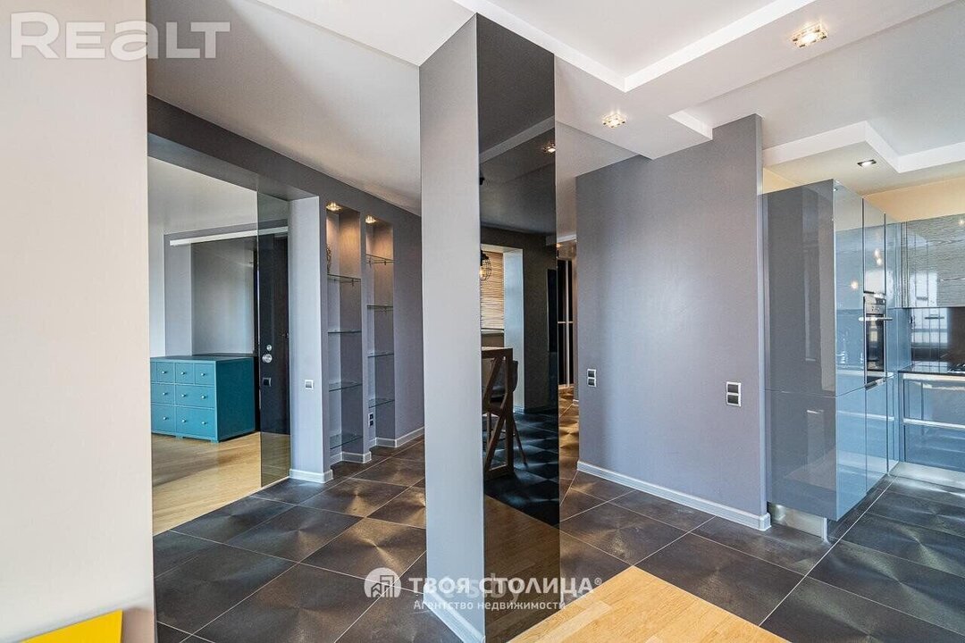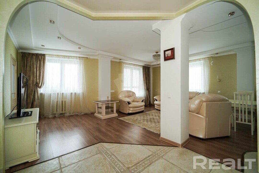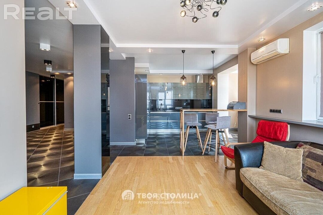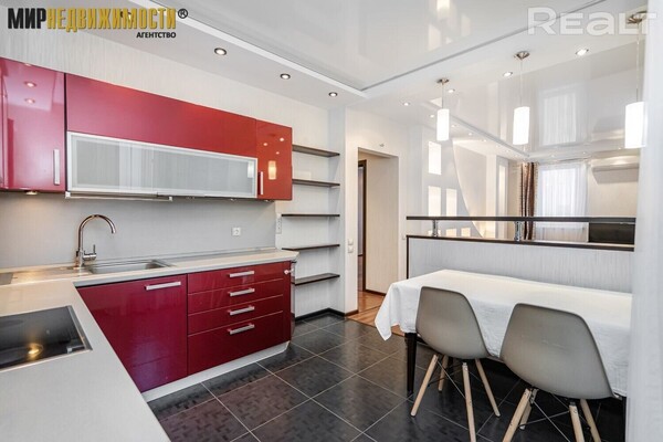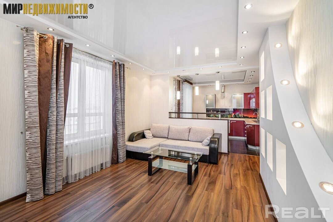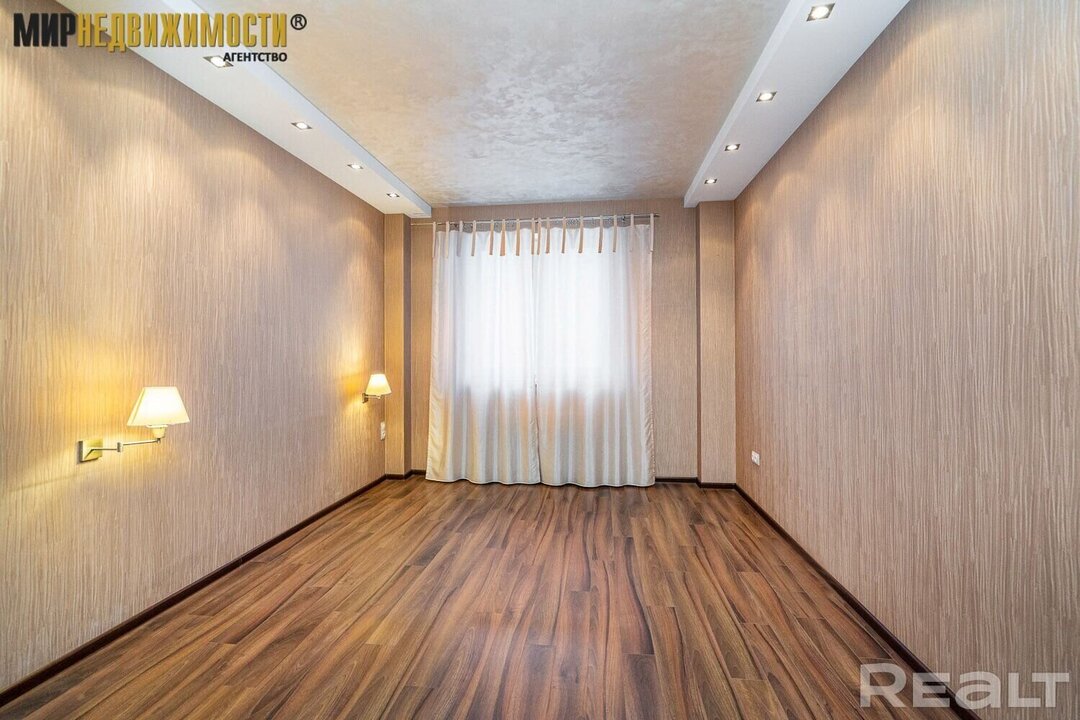 Также в доме продается интересная трехкомнатная квартира. Ее площадь составляет 100 квадратных метров. Квартира состоит из кухни-гостиной и двух жилых комнат. Ремонт в этом жилье выполнен по индивидуальному дизайн-проекту. В квартире можно заметить колонны, люстры, разноуровневые потолки. Вся мебель и техника остается новым владельцам. Стоимость — 155 тысяч долларов (1544 доллара — за метр).
