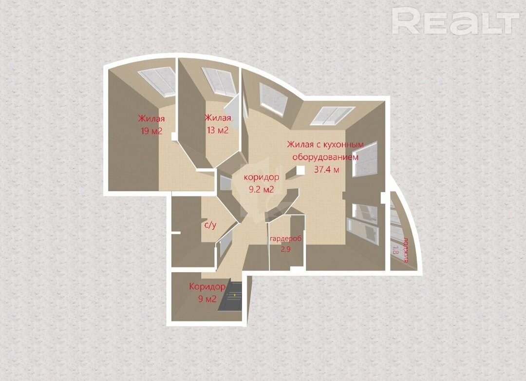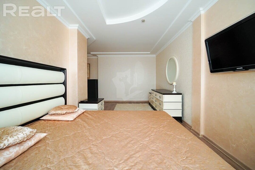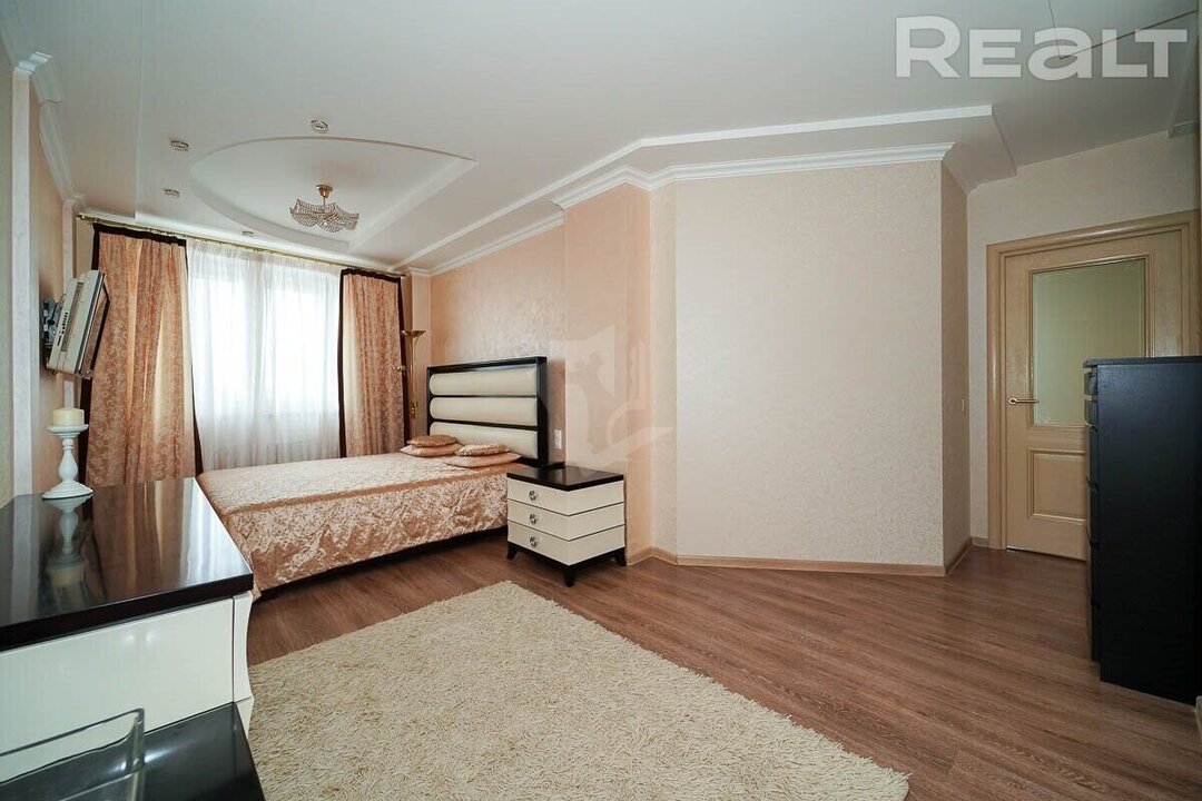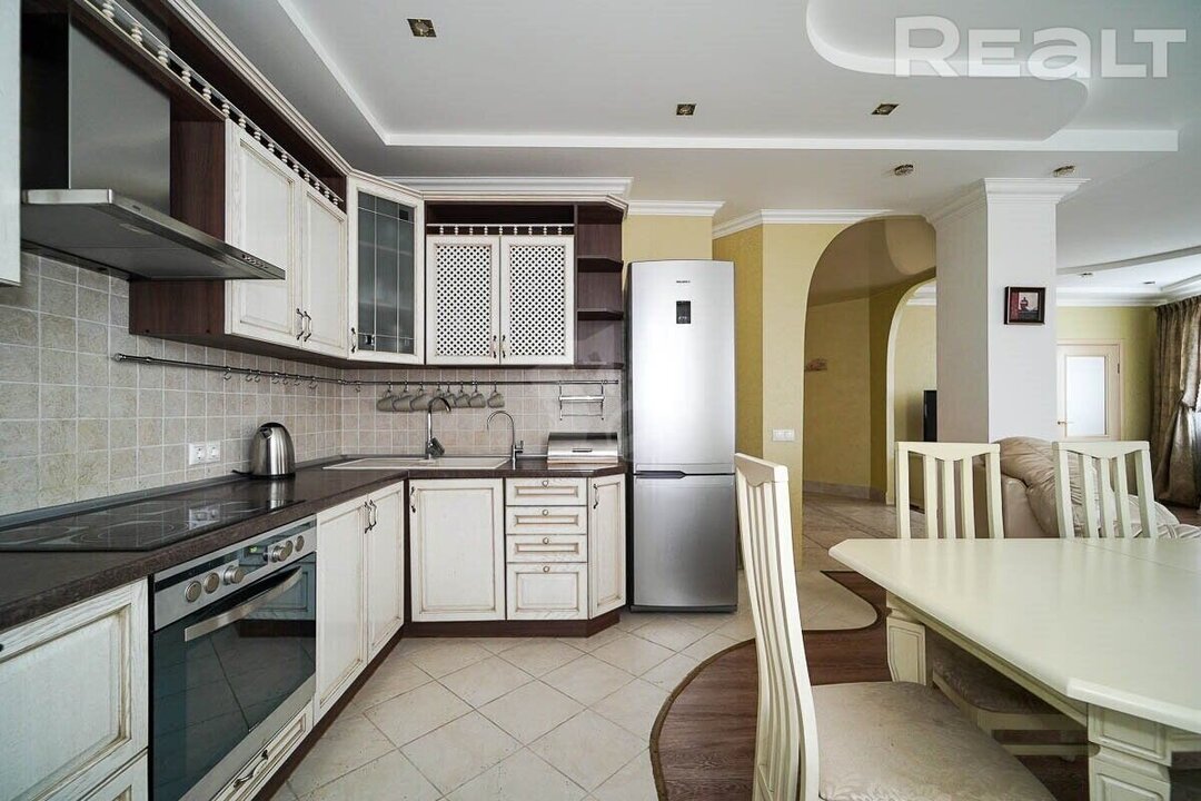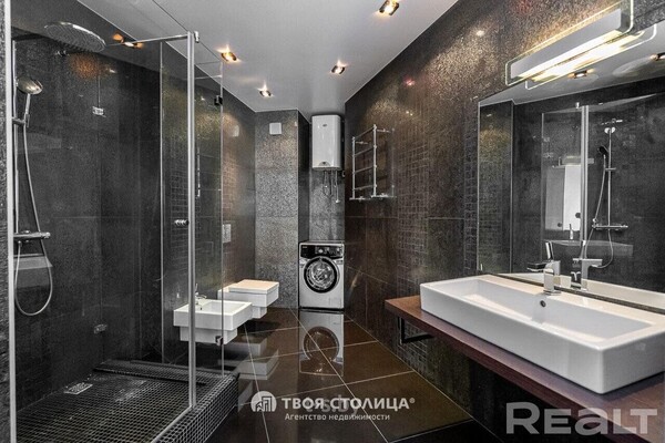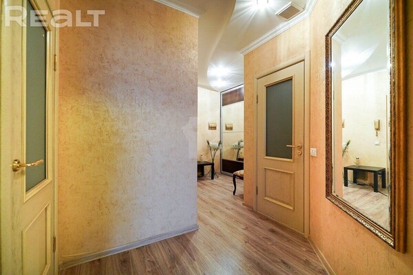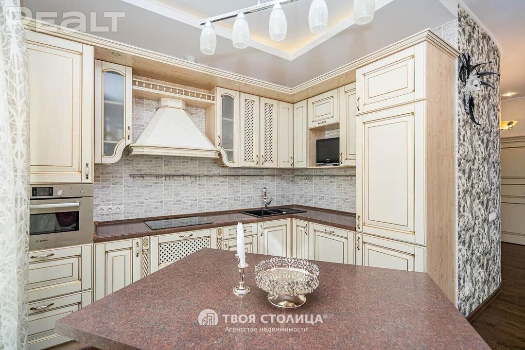 Также в доме продается интересная трехкомнатная квартира. Ее площадь составляет 100 квадратных метров. Квартира состоит из кухни-гостиной и двух жилых комнат. Ремонт в этом жилье выполнен по индивидуальному дизайн-проекту. В квартире можно заметить колонны, люстры, разноуровневые потолки. Вся мебель и техника остается новым владельцам. Стоимость — 155 тысяч долларов (1544 доллара — за метр).