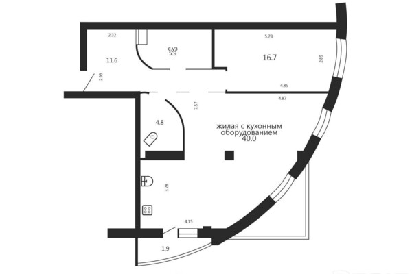 А вот эта необычная квартира имеет ярко выраженную индивидуальность. Трешка расположена на семнадцатом этаже. Квартиру площадью 79 квадратных метров отличает необычная планировка. Жилье получилось почти треугольным, но с полукруглой стеной. При этом пространство удобно зонировано на общественные и приватные уголки. В стоимость квартиры входит мебель и техника. Стоимость — 129,5 тысячи долларов (1639 долларов — за метр).