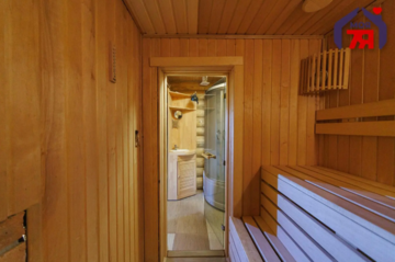 Внутри сохранен вид натурального дерева. На первом этаже дома расположены кухня-гостиная с выходом на террасу, кладовая, топочная, а также баня с душем и отдельным санузлом. В гостиной имеется камин, но он на данный момент зашит.