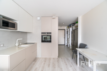 Студия продается с мебелью и бытовой техникой. На полу лежат паркетная доска, ламинат повышенной прочности и плитка. Тут также имеется встроенная кухня с фасадами из керамического покрытия. В квартире стоит стол из натурального дуба, установлены кондиционер и система вентиляции. Сделан натяжной потолок.
