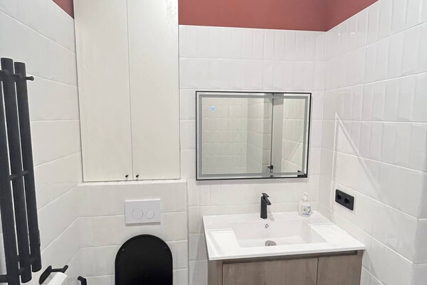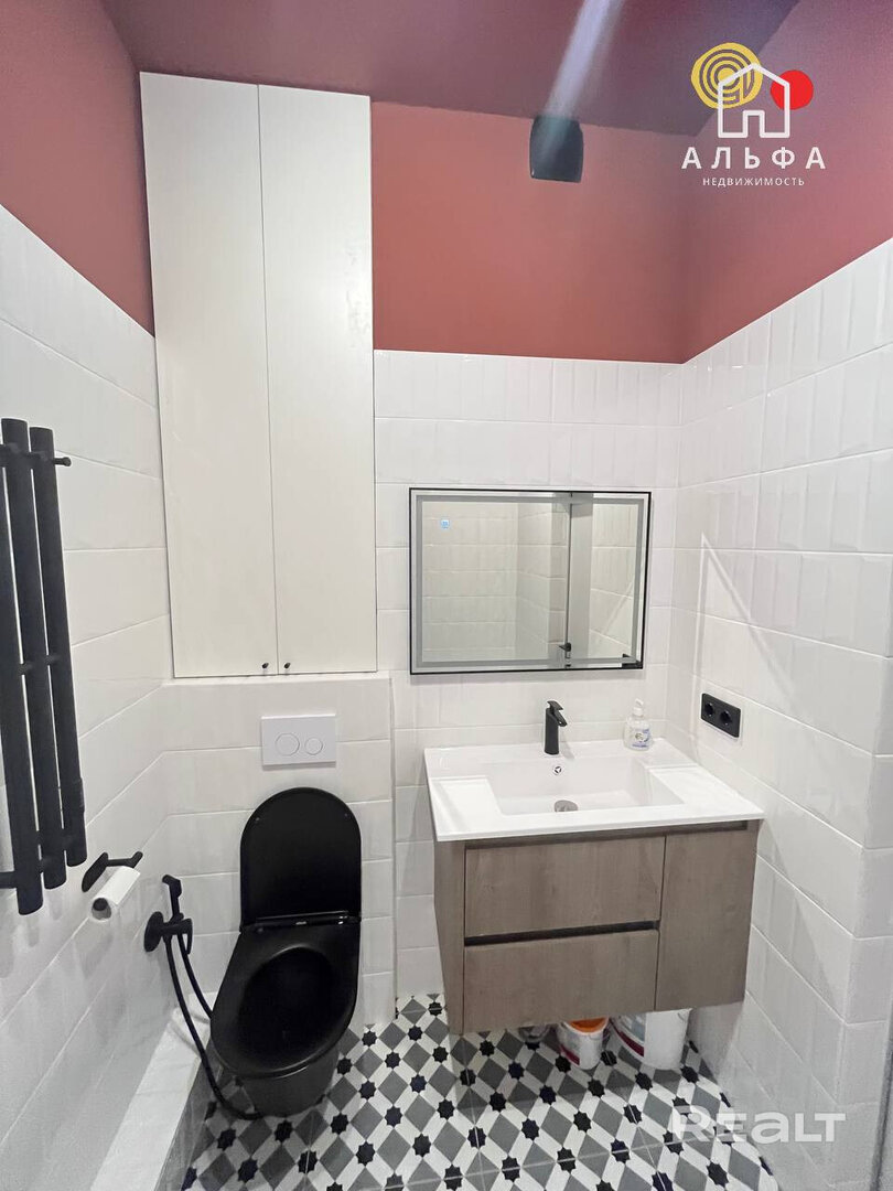 Метраж в квартире стандартный для студии в Минск Мире — 33 квадрата. Аккуратный лаконичный ремонт с контрастными терракотовыми вкраплениями — стен в прихожей и верхних фасадов кухни. Но самое необычное здесь, конечно, второй этаж, который позволил разделить пространство и организовать отдельно спальную зону. Вот как это выглядит.