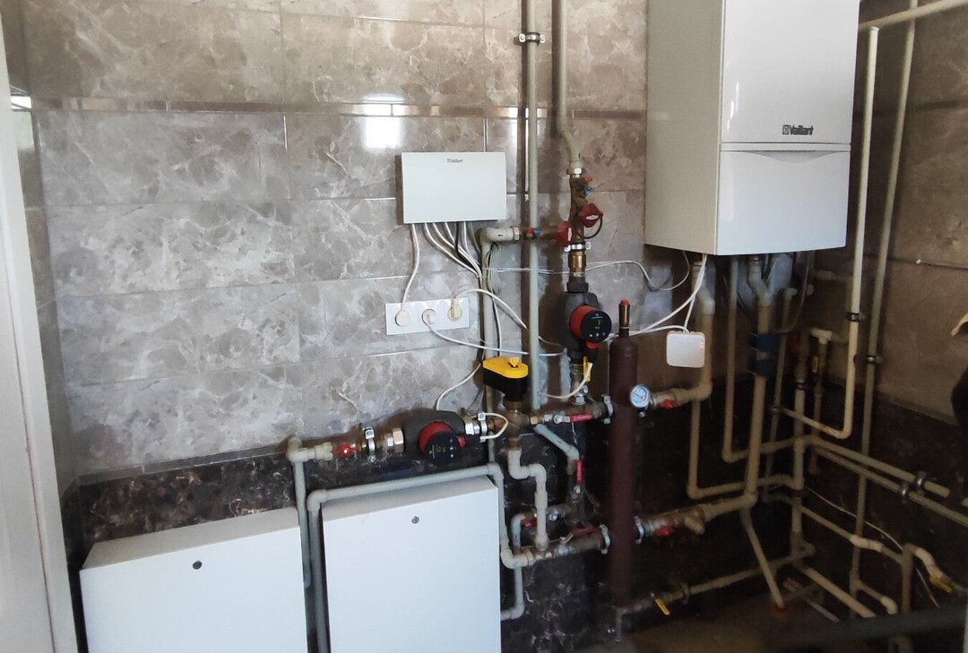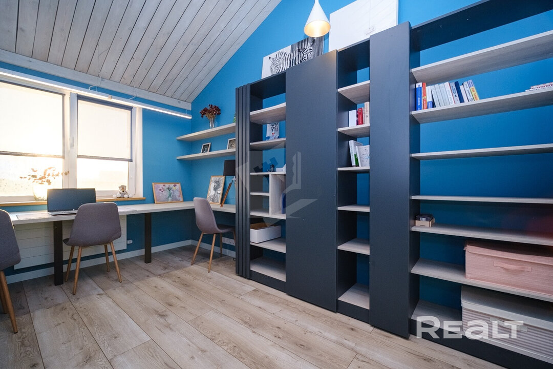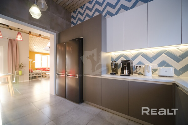 Два входа, по санузлу на этаж, 3 спальни, большая гостиная-кухня снизу и поменьше комната с кухонным оборудование наверху.