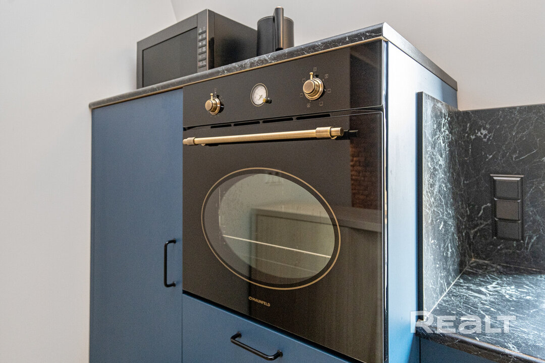 В квартире 44 квадрата общей площади, 32 из них жилые. Фактически это евродвушка — кухня совмещена с гостиной зоной. Кстати, кухня — это один из ярких акцентов в квартире. Фасады выполнены в глубоком синем цвете, а духовой шкаф в ретро-стиле. Около рабочей зоны в кухне два окна, откуда в комнату поступает много света.