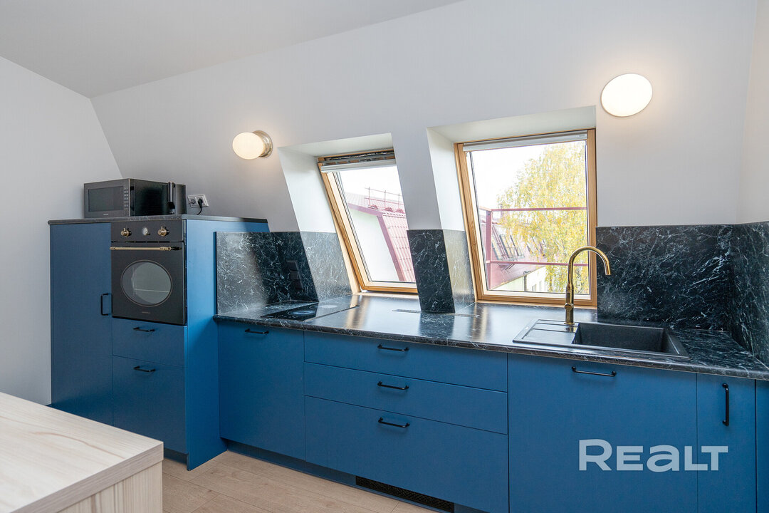 В квартире 44 квадрата общей площади, 32 из них жилые. Фактически это евродвушка — кухня совмещена с гостиной зоной. Кстати, кухня — это один из ярких акцентов в квартире. Фасады выполнены в глубоком синем цвете, а духовой шкаф в ретро-стиле. Около рабочей зоны в кухне два окна, откуда в комнату поступает много света.